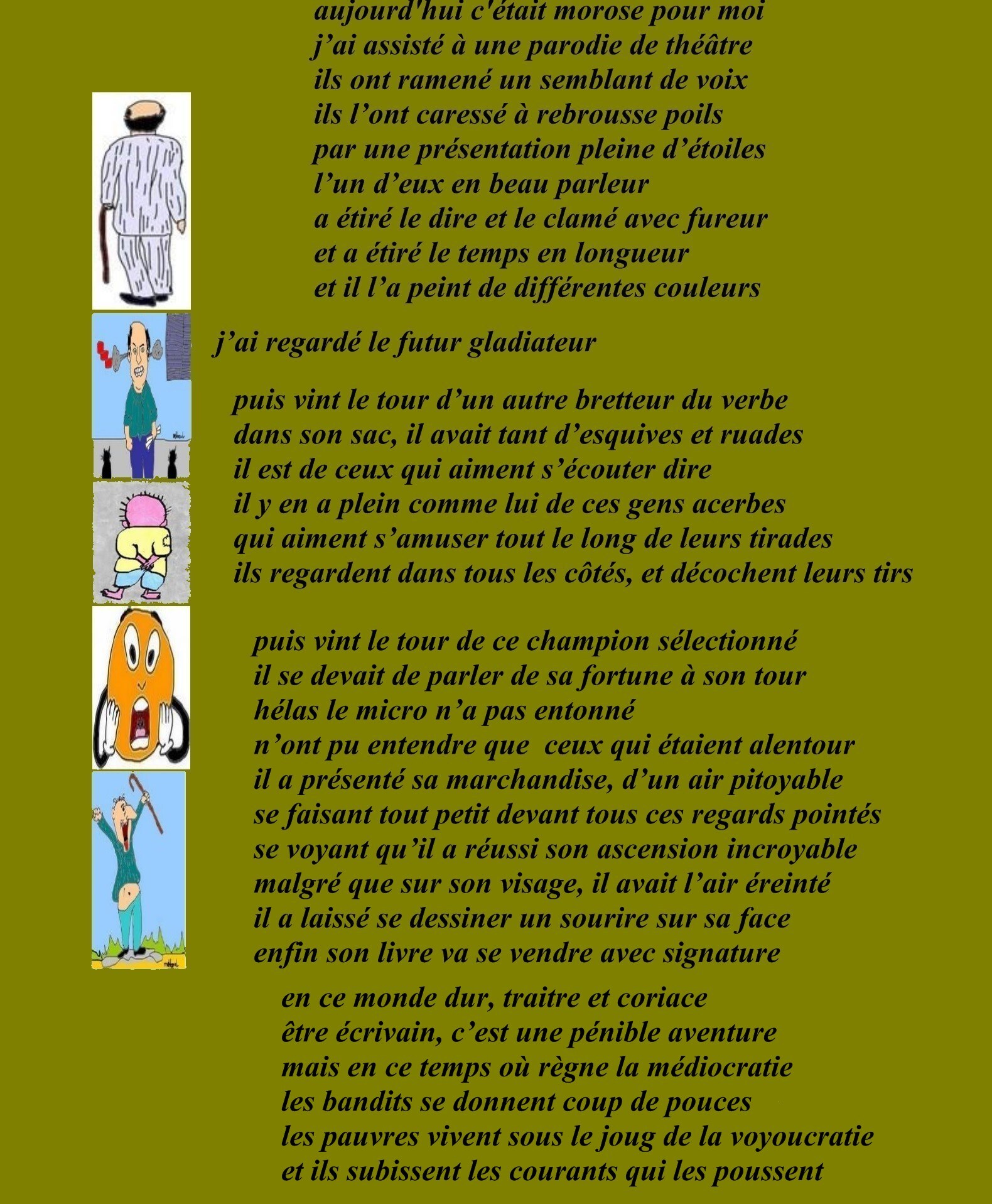Un véritable constat poétique plein d’amertume sur la médiocratie actuelle, où n’est pas forcément célèbre celui qui y aurait droit ! Et la vie d’écrivain est de nos jours très compliqué, chacun est perdu dans la vaste plaine de livres et seuls ceux qui ont du pouvoir peut s’asseoir au sommet sur les têtes des petits pauvres !