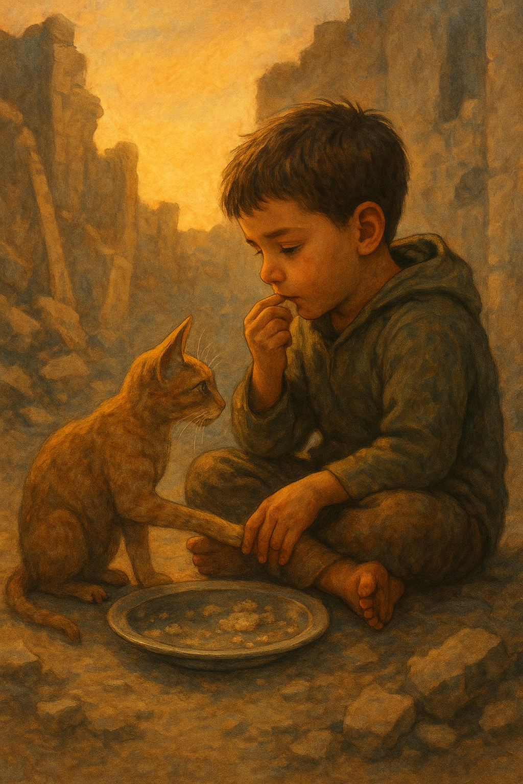 C’est bien un instant suspendu entre un enfant et un chat, mais combien l’image personnellement me touche … car des enfants actuellement sont morts de faim ! Un hôpital encore debout l’annonce !