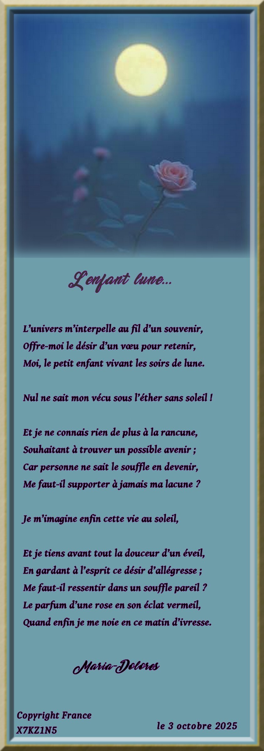 [size=large]Sous la clarté tremblante de la lune, un enfant dialogue avec l’univers. Entre le souvenir et le désir d’éveil, il cherche la lumière qui le délivrera de l’ombre. Ce poème est une marche intérieure, une aube qui s’invente.