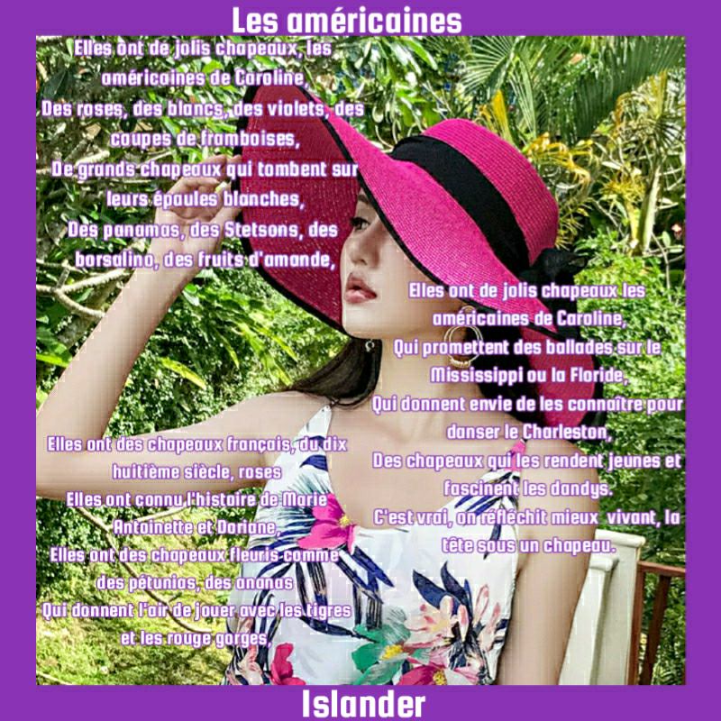 Des panamas, des Stetsons, des borsalino, des fruits d’amande,Elles ont des chapeaux français, du dix huitième siècle, roses
