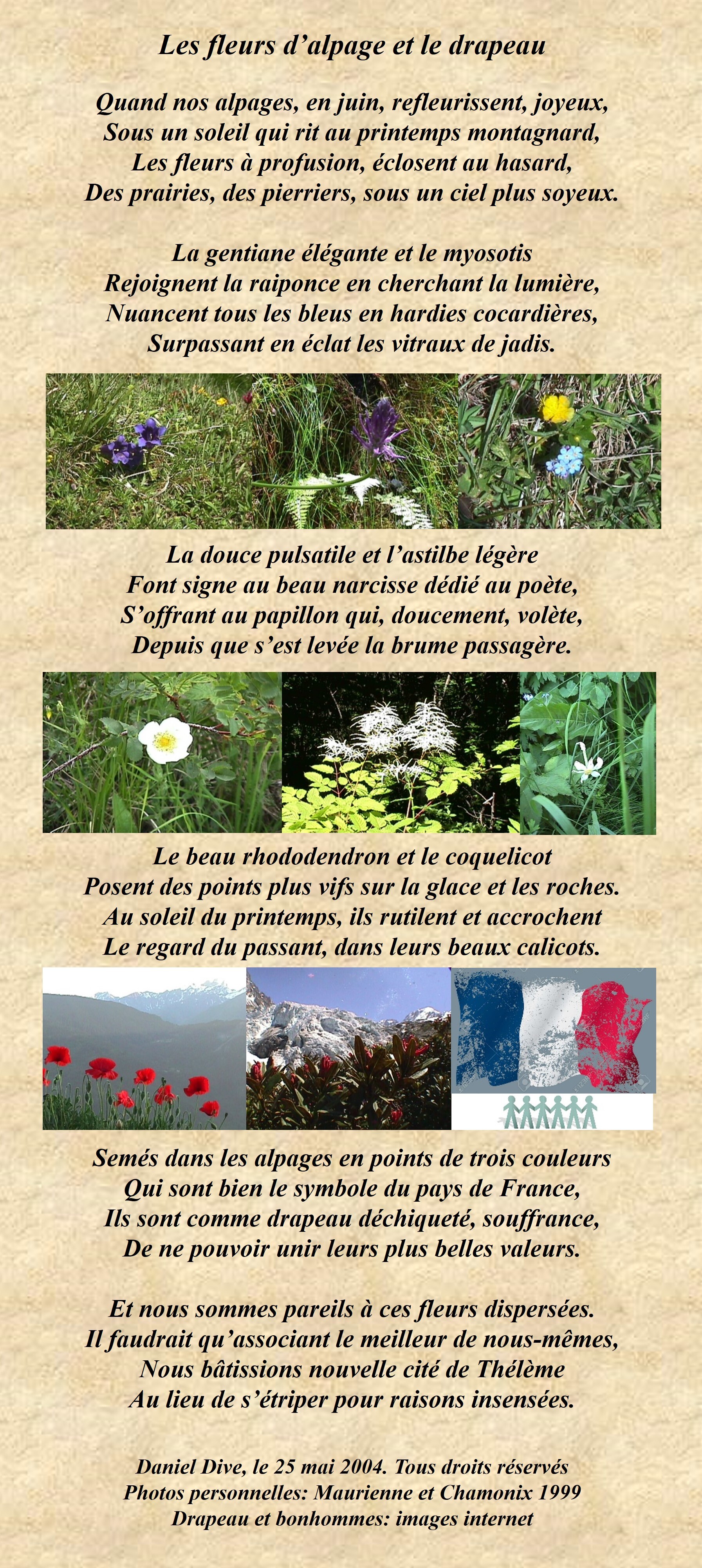 Un merveilleux poème rendant grâce à la beauté des alpages et de la nature enchantée par les belles fleurs ici ou là, et dont je suis d’avis avec le dernier quatrain très humaniste que tout le monde devrait suivre en exemple pour voir enfin présente la paix dans le monde.