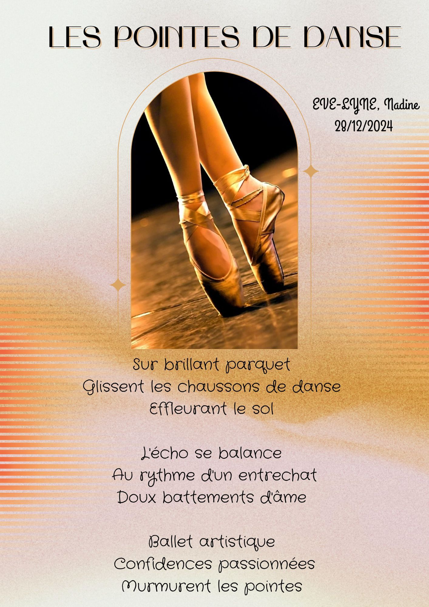 Les pointes de danse Accueil › Vos poèmes ***UN SEUL PAR JOUR*** Les « poèmes » érotiques descriptifs ne sont pas les bienvenus... Ce sujet contient 7 réponses, 6 participants et a été mis à jour pour la dernière fois par Eve-Lyne, le 05-01-2025 11:11. Créateur Sujet 5 janvier 2025 à 11h11 #2717499 Plume de platine★★★★★☆ Eve-Lyne Sujet: 747Réponses: 6966 Pointes de danse Sur brillant parquet Glissent les chaussons de danse Effleurant le sol L’écho se balance Au rythme d’un entrechat Doux battements d’âme Ballet artistique Confidences passionnées Murmurent les pointes EVE-LYNE, Nadine 30 décembre 2024 EvE-LyNe Créateur Sujet Vous lisez 6 fils de discussion Auteur Réponses 30 décembre 2024 à 11h14 #3549407 Plume de diamant★★★★★★ cyrael Sujet: 4849Réponses: 48873 mon amie NADINE … tu fus——————— petite ballerine danser c ‘est ta passion !!!!!!!!!!!!!!!!! __________________ merci pour ce tres beau… poème qui fait rêver toutes les petites filles * vive le partage douce journée de lundi mes bisous du coeur l'Amour rayonne quand l'Ame s'?l?ve, citation maryjo 30 décembre 2024 à 13h22 #3549416 Mascotte d'Oasis TIZI MOHAMED Sujet: 1702Réponses: 25075 sur la pointe des pieds tracer de beaux signes pour se faire plaisir https://www.edilivre.com/peregrinations-29f53ef39f.html/ https://www.edilivre.com/le-spleen-de-la-logique-de-l-absurde-2c490d0b23.html/ 30 décembre 2024 à 16h16 #3549453 Fran?ois Sujet: 300Réponses: 49951 Bonsoir Eve-Lyne, très beau poème de la pointe de la plume Amitiés La po?sie, c'est comme la cuisine, le mot faitout 00063312-1 30 décembre 2024 à 17h40 #3549477 SybillaMaître des clés Sujet: 5464Réponses: 79667 Bonsoir Chère Amie poétesse Nadine, Cela me rappelle bien des souvenirs… J’ai encore mes chaussons que je garde comme un trésor… C’est une merveilleuse poésie aérienne où tu as esquissé ces pas de danse avec grâce et toute la féerie de ce très grand Art ! Superbe ! Passe de Joyeuses fêtes ! Belle soirée Chère Amie poétesse Nadine ! Toutes mes amitiés Gros bisous Sybilla Le r?ve est le poumon de ma vie (Citation de Sybilla) 1 janvier 2025 à 8h57 #3549577 Plume de platine★★★★★☆ Eve-Lyne Sujet: 747Réponses: 6966 Mes remerciements amis poétesses et poètes pour vos lectures et vos commentaires sous les pointes de danse Bonne année 2025 Amitiés en bises EvE-LyNe 1 janvier 2025 à 18h20 #3549640 Mascotte d'Oasis GODART Sujet: 3345Réponses: 9485 des pointes qui effleurent l’art du bonheur BONNE ET HEUREUSE ANNEE Geneviève 2 janvier 2025 à 19h57 #3549784 Plume de platine★★★★★☆ Eve-Lyne Sujet: 747Réponses: 6966 Mes remerciements amis poétesses et poètes pour vos lectures et vos commentaires sous les pointes de danse Bonne année 2025 Amitiés en bises EvE-LyNe Auteur Réponses Vous lisez 6 fils de discussion Vous devez être connecté pour répondre à ce sujet. Connexion Identifiant: Mot de passe: Rester connecté Connexion Log in / Register