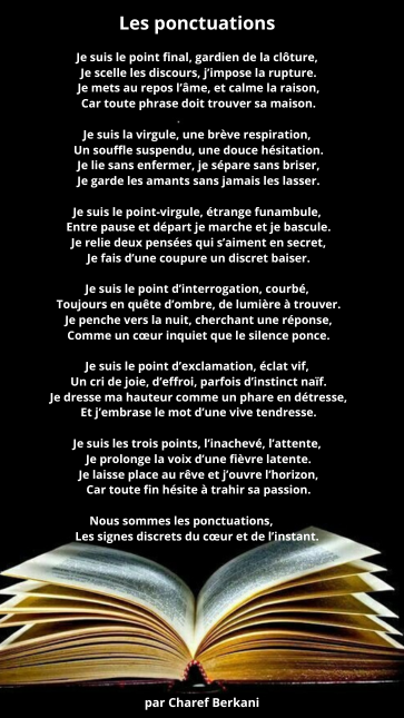 En vérité, les ponctuations sont les gestes de l’amour : une pause, une hésitation, une question, une clameur, un silence… Elles rappellent que l’essentiel n’est pas toujours dans le mot, mais dans l’espace fragile qui l’entoure.Charef Berkani