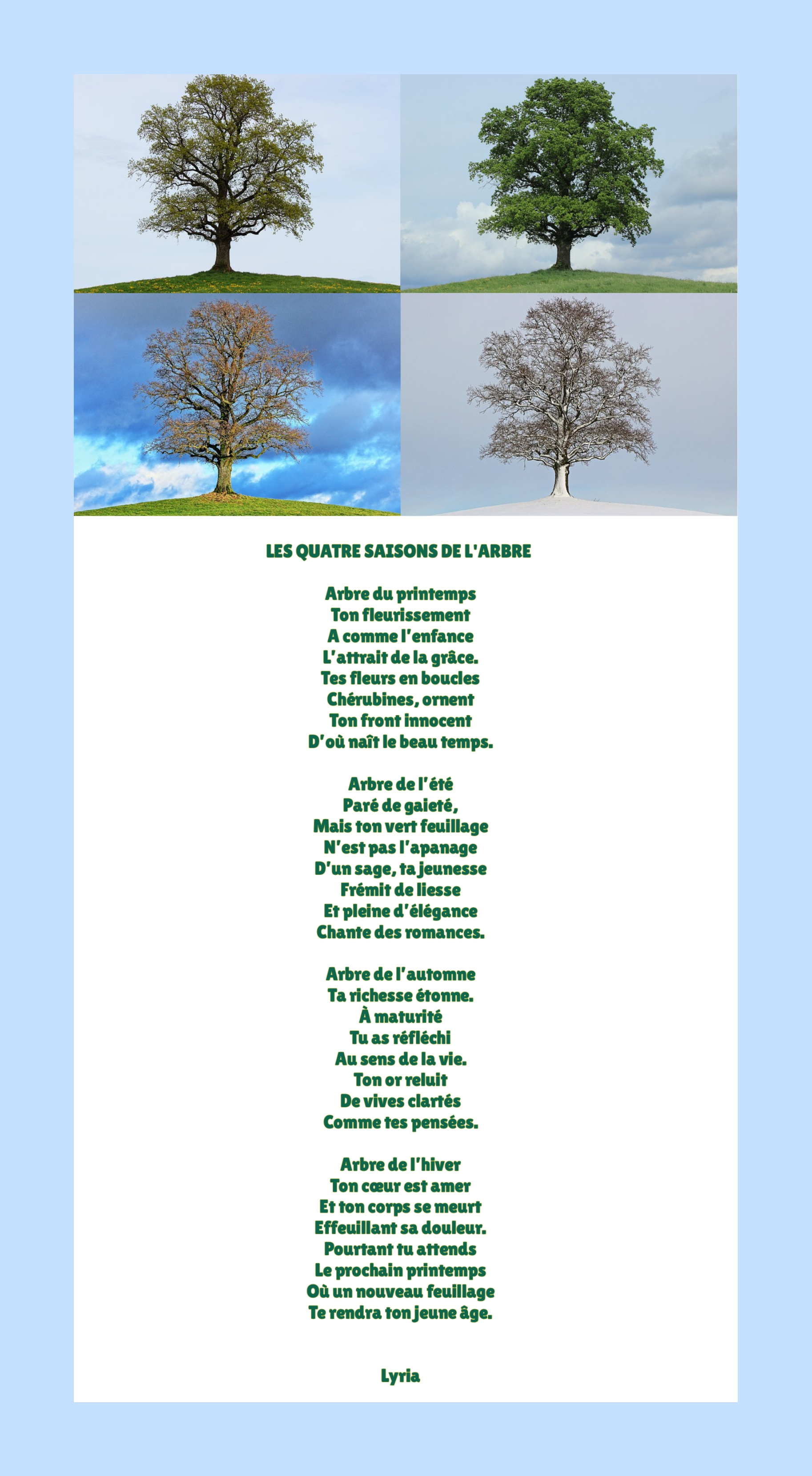 La ronde des saisons et un merveilleux hommage à l’arbre !!