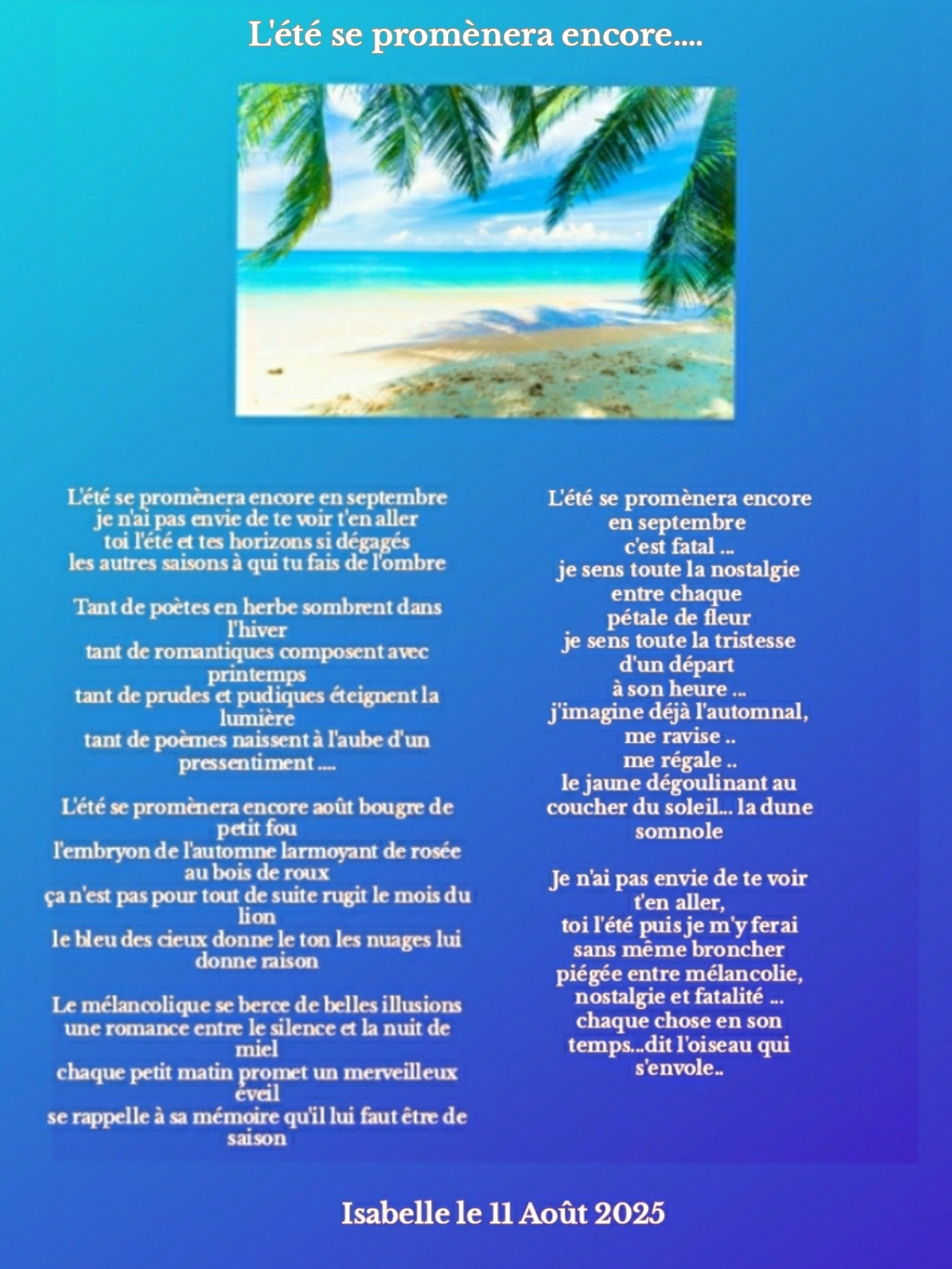Merci poétesse, j’ai bien aimé. L’été est lumière et liberté. C’est la saison du pauvre dit-on chez nous. Il décline certes, mais nous déclinons aussi.