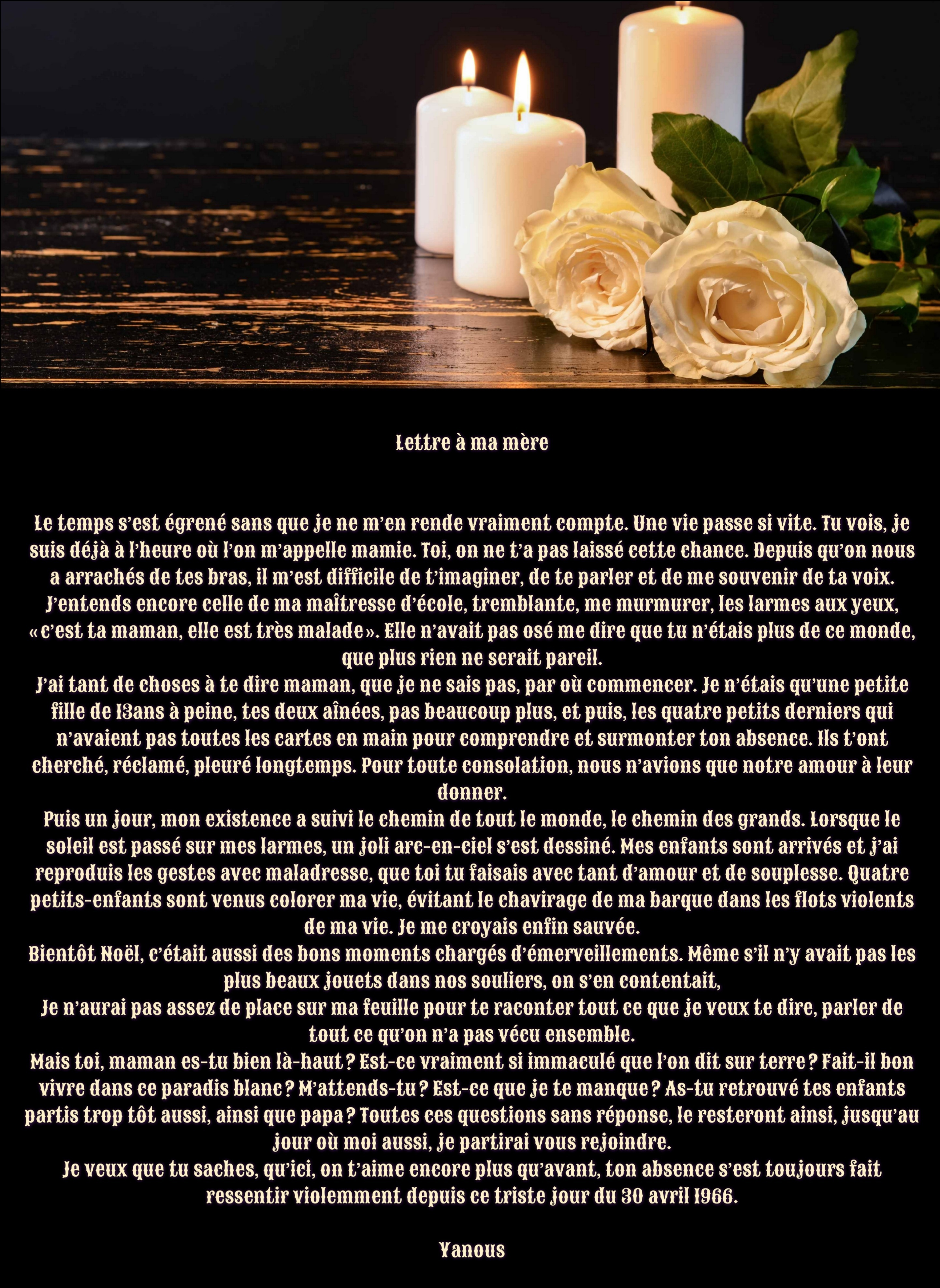 Le temps s’est égrené sans que je ne m’en rende vraiment compte. Une vie passe si vite. Tu vois, je suis déjà à l’heure où l’on m’appelle mamie. Toi, on ne t’a pas laissé cette chance. Depuis qu’on nous a arrachés de tes bras, il m’est difficile de t’imaginer, de te parler et de me souvenir de ta voix. J’entends encore celle de ma maîtresse d’école, tremblante, me murmurer, les larmes aux yeux, « c’est ta maman, elle est très malade ». Elle n’avait pas osé me dire que tu n’étais plus de ce monde, que plus rien ne serait pareil.