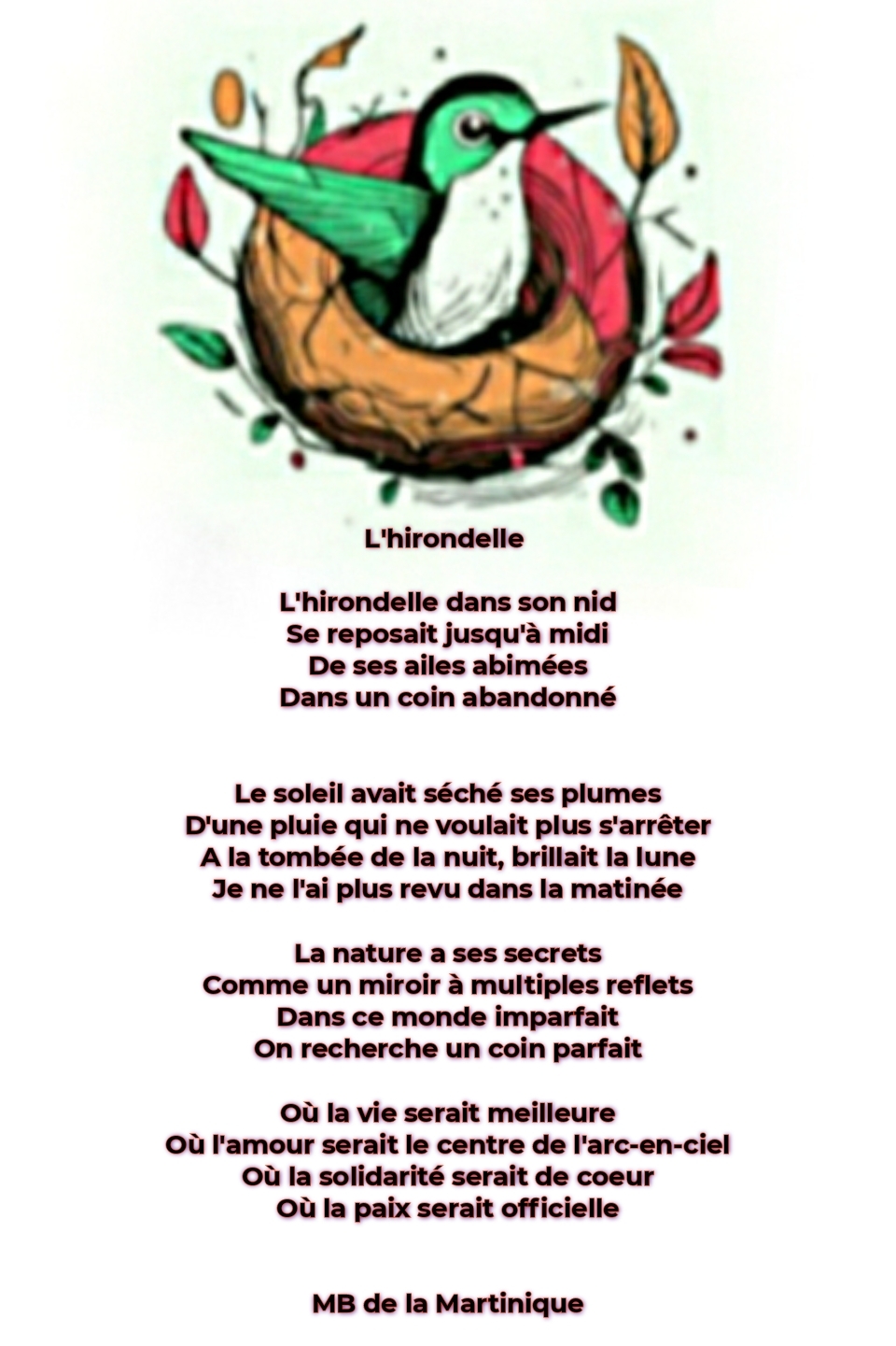 Un magnifique poème où vous nous donnez l’occasion de nous émouvoir sur le sort d’une hirondelle blessée. J’aime beaucoup la dernière strophe qui nous fait rêver à un monde meilleur en espérant qu’un jour il sera réalité