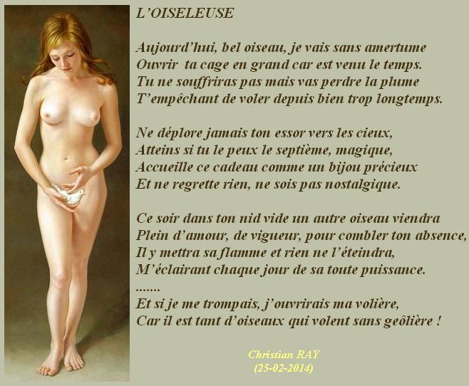 » L’oiseleuse « Accueil › Vos poèmes ***UN SEUL PAR JOUR*** Les « poèmes » érotiques descriptifs ne sont pas les bienvenus... Ce sujet contient 2 réponses, 3 participants et a été mis à jour pour la dernière fois par Fran?ois, le 23-02-2024 19:18. Créateur Sujet 23 février 2024 à 19h18 #2709529 Mascotte d'Oasis christian Sujet: 6554Réponses: 13392 [url=https://zupimages.net/viewer.php?id=24/08/ncn0.jpg][/url] Christian RAY avec Michel Drucker et Patrice Laffont Créateur Sujet Vous lisez 1 fil de discussion Auteur Réponses 23 février 2024 à 17h04 #3497908 SybillaMaître des clés Sujet: 5464Réponses: 79667 Bonsoir ChrisR, Toujours des poésies amusantes ! Belle soirée cher ami poète ChrisR ! Toutes mes amitiés Sybilla Le r?ve est le poumon de ma vie (Citation de Sybilla) 23 février 2024 à 17h12 #3497910 Fran?ois Sujet: 300Réponses: 49951 Bonsoir Chris, charmant poème Amitiés La po?sie, c'est comme la cuisine, le mot faitout 00063312-1 Auteur Réponses Vous lisez 1 fil de discussion Vous devez être connecté pour répondre à ce sujet. Connexion Identifiant: Mot de passe: Rester connecté Connexion Log in / Register