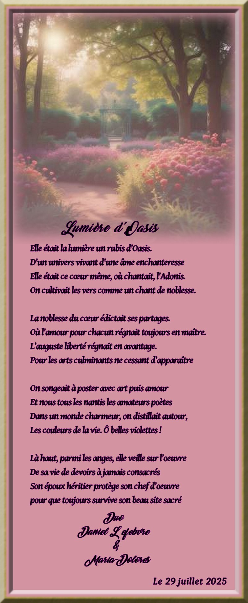 Les couleurs de la vie. Ô belles violettes !Là haut, parmi les anges, elle veille sur l’oeuvre