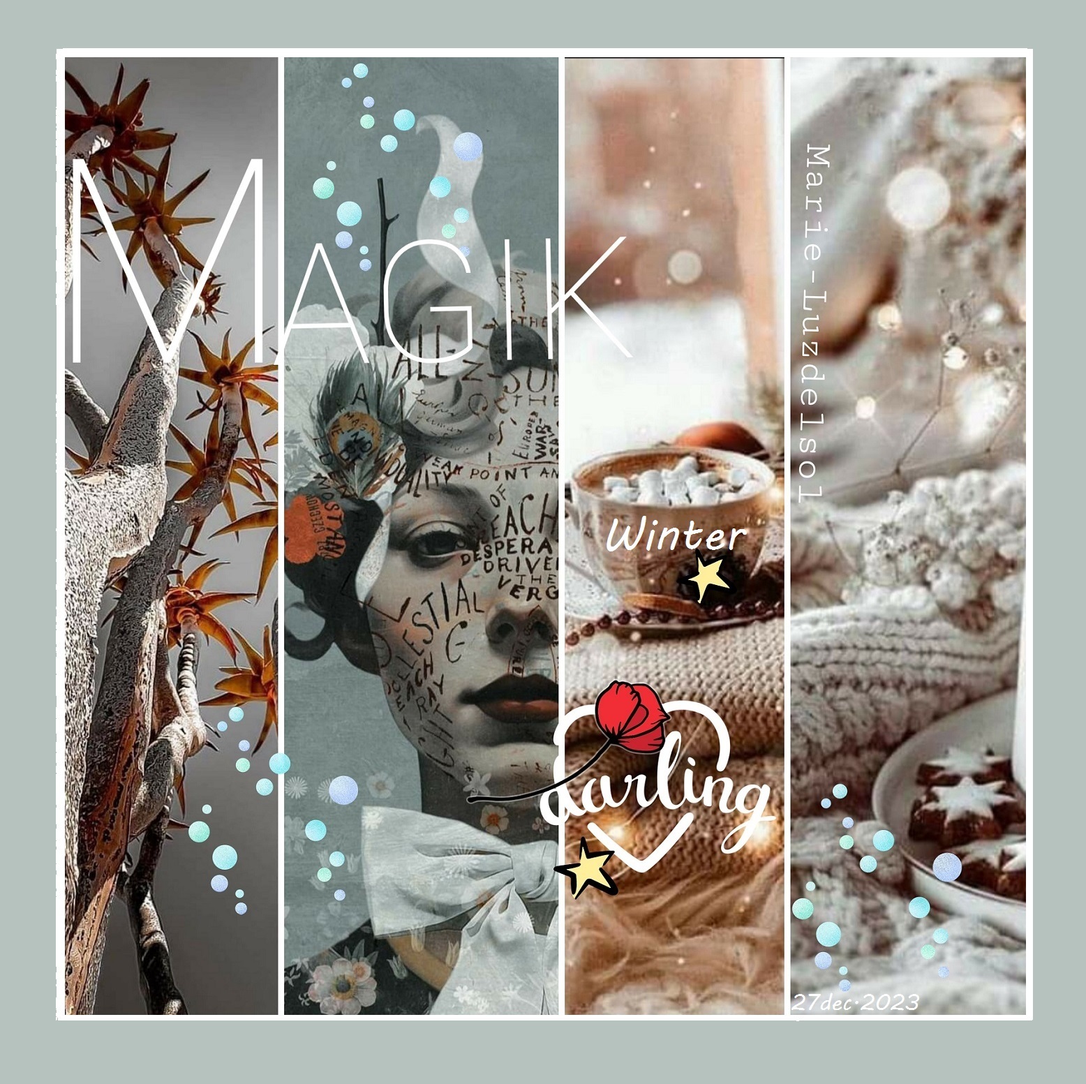 MAGIK WINTER- Dec. 2023 Accueil › Créations artistiques Ce sujet contient 4 réponses, 4 participants et a été mis à jour pour la dernière fois par Marie Michel, le 28-12-2023 12:54. Vous lisez 4 fils de discussion Auteur Messages 27 décembre 2023 à 10h08 #3487942 Plume de diamant★★★★★★ cyrael Sujet: 4849Réponses: 48873 MERVEILLEUSE CREATION douce neige, fabuleux tableau pour un hiver poétique, joli mercredi ma douce amie MARIE LUZ DEL SOL bisous du coeur l'Amour rayonne quand l'Ame s'?l?ve, citation maryjo 27 décembre 2023 à 17h31 #3487977 Mascotte d'Oasis TIZI MOHAMED Sujet: 1702Réponses: 25075 superbe création https://www.edilivre.com/peregrinations-29f53ef39f.html/ https://www.edilivre.com/le-spleen-de-la-logique-de-l-absurde-2c490d0b23.html/ 27 décembre 2023 à 21h05 #3487994 Sybilla Sujet: 5464Réponses: 79667 Bonsoir ma chère amie Marie, Magnifique création en partage ! Belle soirée chère amie poétesse Marie ! Toutes mes amitiés Belles fêtes de fin d’année ! Gros bisous Sybilla Le r?ve est le poumon de ma vie (Citation de Sybilla) 28 décembre 2023 à 12h54 #2707941 Mascotte d'Oasis Marie Michel Sujet: 2224Réponses: 18307 [url=https://zupimages.net/viewer.php?id=23/52/12zj.jpg][/url] (Création-montage- Marie-Luzdelsol – Dec. 2023) Les gens vivent comme s'ils n'allaient jamais mourir... Et meurent comme s'ils n'avaient jamais v?cu. Le Dala? Lama Nul ne peut atteindre l'aube sans passer par le chemin de la nuit? Khalil Gibran 28 décembre 2023 à 12h54 #3488058 Mascotte d'Oasis Marie Michel Sujet: 2224Réponses: 18307 Merci à tous pour vos touchants messages Bonnes fêtes de fin d’année Bises de Luz Les gens vivent comme s'ils n'allaient jamais mourir... Et meurent comme s'ils n'avaient jamais v?cu. Le Dala? Lama Nul ne peut atteindre l'aube sans passer par le chemin de la nuit? Khalil Gibran Auteur Messages Vous lisez 4 fils de discussion Vous devez être connecté pour répondre à ce sujet. Connexion Identifiant: Mot de passe: Rester connecté Connexion Log in / Register
