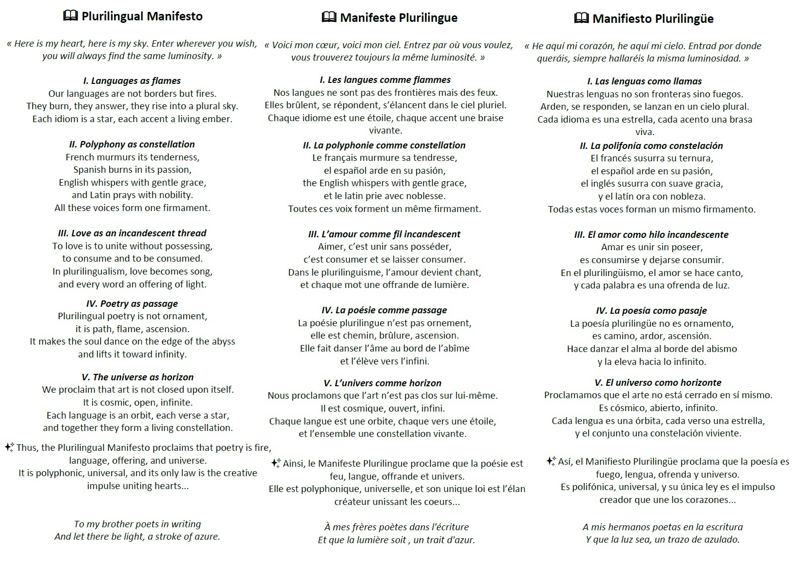 et l’ensemble une constellation vivante.✨ Ainsi, le Manifeste Plurilingue proclame que la poésie est feu, langue, offrande et univers.