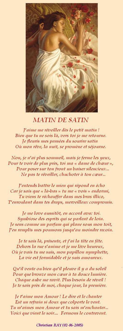 » MATIN DE SATIN « Accueil › Vos poèmes ***UN SEUL PAR JOUR*** Les « poèmes » érotiques descriptifs ne sont pas les bienvenus... Ce sujet contient 5 réponses, 6 participants et a été mis à jour pour la dernière fois par isabelle, le 15-06-2024 17:30. Créateur Sujet 15 juin 2024 à 17h30 #2712063 Mascotte d'Oasis christian Sujet: 6554Réponses: 13392 [url=https://zupimages.net/viewer.php?id=24/21/p05e.jpg][/url] Christian RAY avec Michel Drucker et Patrice Laffont Créateur Sujet Vous lisez 4 fils de discussion Auteur Réponses 26 mai 2024 à 15h13 #3515839 Mascotte d'Oasis TIZI MOHAMED Sujet: 1702Réponses: 25075 lorsque l’amour sur un nuage vogue sur des poches d’eau au dessous de lui que de paysages un rêve d’amoureux du tout beau merci poète pour le charme dans le dire, bien à toi https://www.edilivre.com/peregrinations-29f53ef39f.html/ https://www.edilivre.com/le-spleen-de-la-logique-de-l-absurde-2c490d0b23.html/ 26 mai 2024 à 16h18 #3515848 Fran?ois Sujet: 300Réponses: 49951 Bonsoir Chris, sublime et lumineux poème Amitiés La po?sie, c'est comme la cuisine, le mot faitout 00063312-1 27 mai 2024 à 0h42 #3515932 SybillaMaître des clés Sujet: 5464Réponses: 79667 Bonsoir ChrisR, Merveilleuse poésie d’amour romantique ! Belle nuit Cher Ami poète ChrisR ! Toutes mes amitiés Sybilla Le r?ve est le poumon de ma vie (Citation de Sybilla) 27 mai 2024 à 17h35 #3516038 Mascotte d'Oasis RomanNovel Sujet: 1171Réponses: 10526 Une très belle déclaration d’amour romantique en ce merveilleux poème. 15 juin 2024 à 17h30 #3519195 Mascotte d'Oasis isabelle Sujet: 2648Réponses: 13734 il est très beau ce poème…en matin de satin… magnifique.. Auteur Réponses Vous lisez 4 fils de discussion Vous devez être connecté pour répondre à ce sujet. Connexion Identifiant: Mot de passe: Rester connecté Connexion Log in / Register