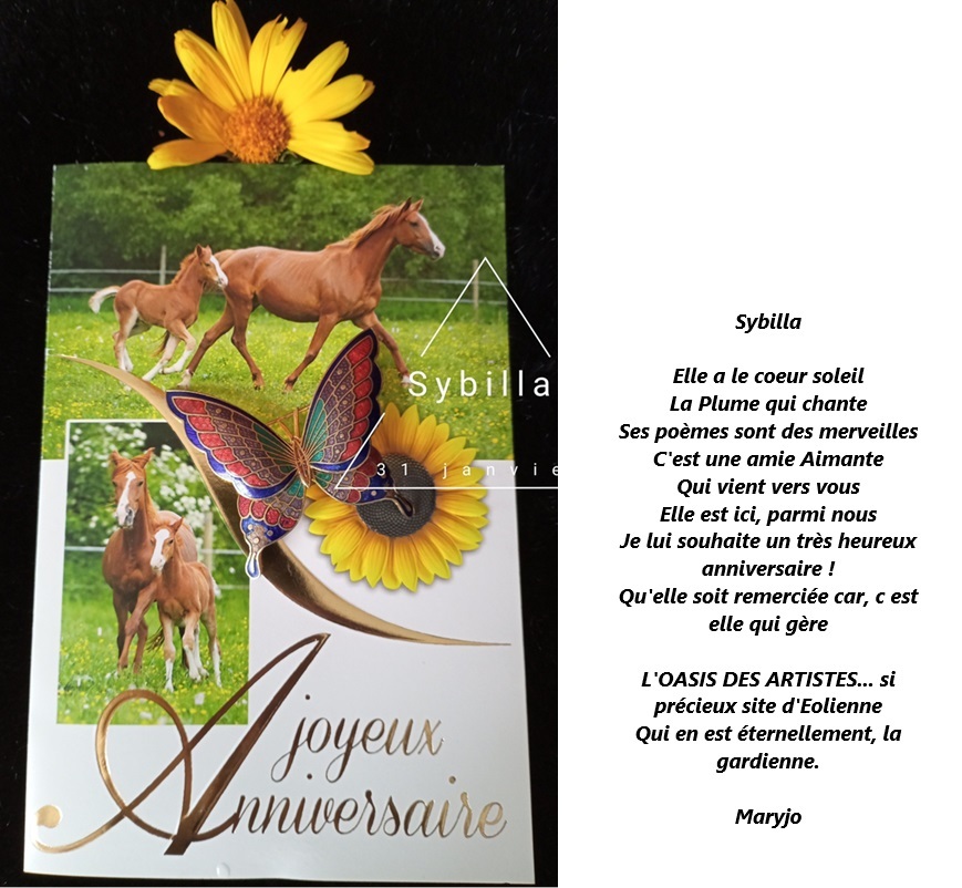 un hommage tout à fait justifié, pour notre chère sybilla, qui dirige avec bienveillance, notre site aimé, merci à vous deux, et bon anniversaire