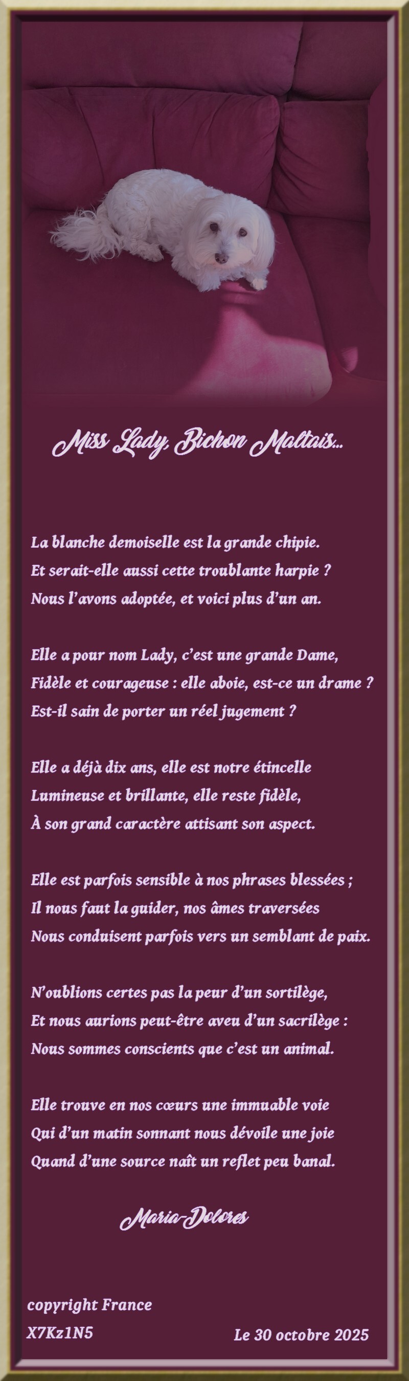 Voilà un magnifique poème en tes vers qui rendent un vibrant hommage à ce bichon maltais qui est de toute beauté.