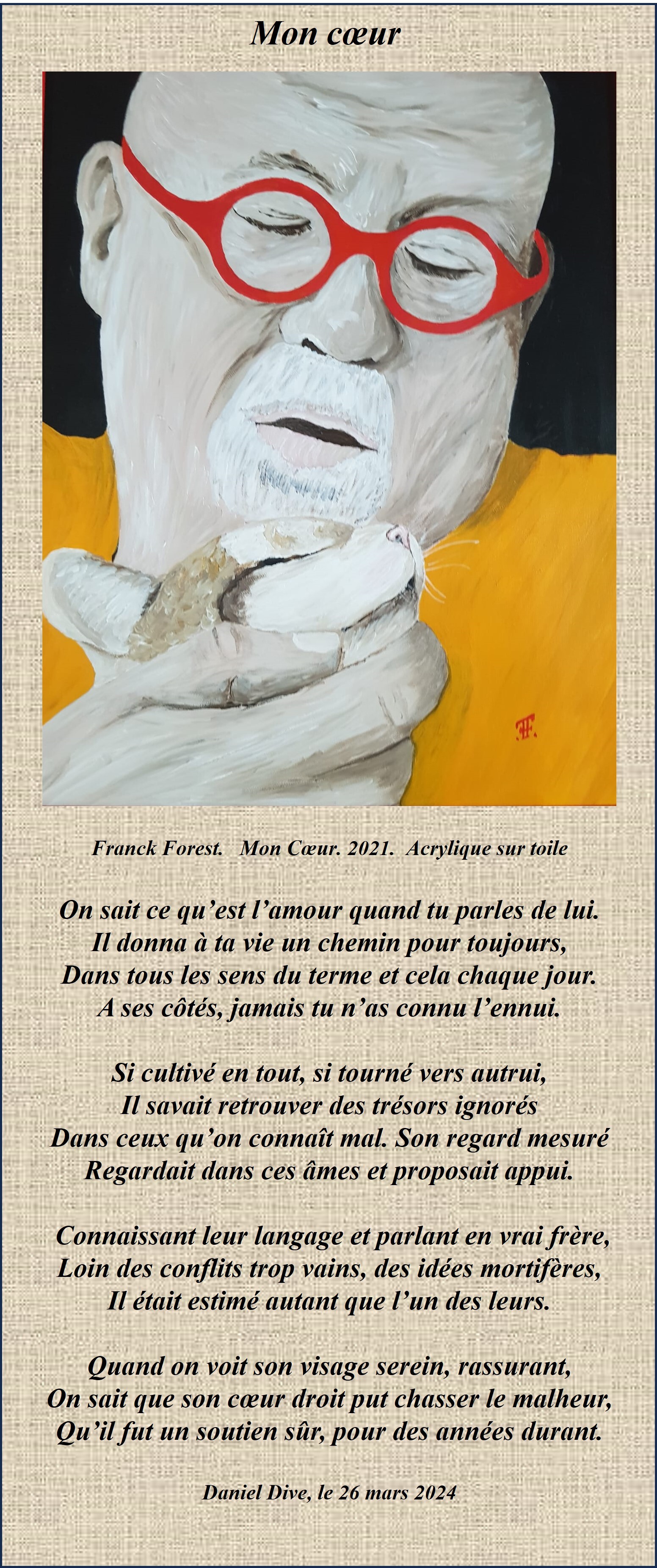 Un magnifique portrait joliment poétisé en ce sonnet pour rendre hommage à cet homme ayant le coeur pur et droit, avec une superbe toile acrylique comme illustration.