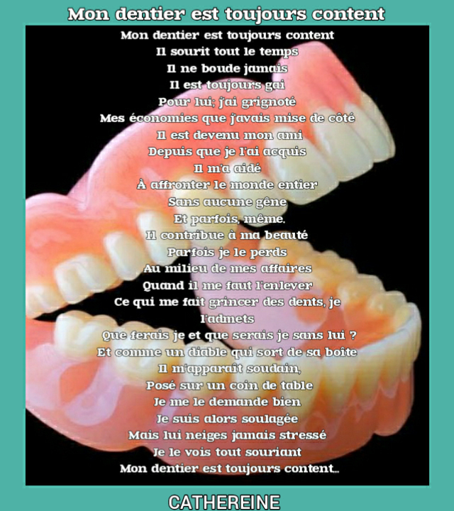 Mon dentier est toujours content…..jE M APPELLE CATHERINEJE N AI NI DON, NI TALENT POUR EXPRIMER LES BELLES CHOSES