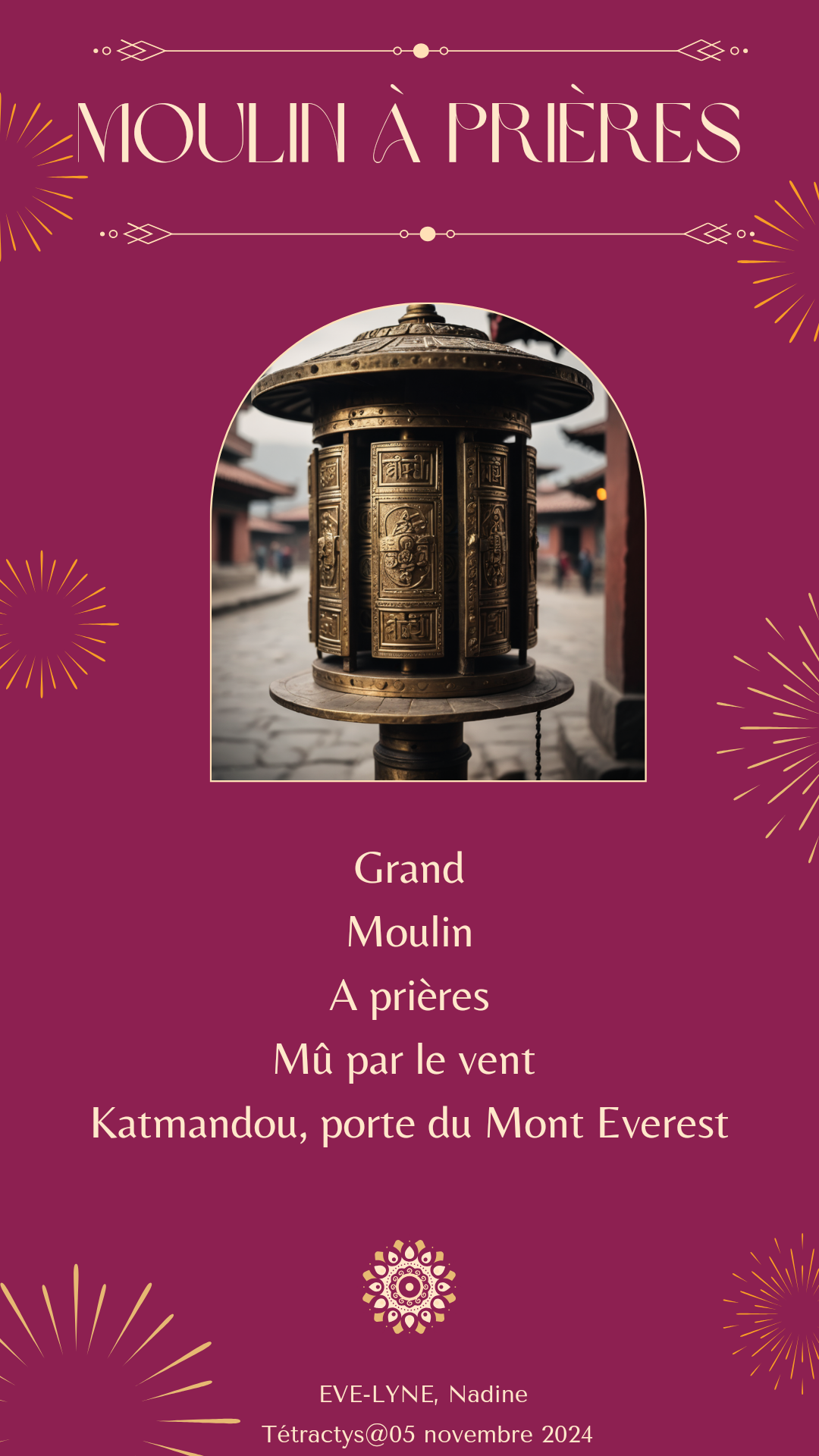 Magnifique tetrakys dont la prosodie est parfaite sur ce moulin que les bouddhistes utilisent pour faire leur prières que ce soit au Népal, au Tibet, etc …