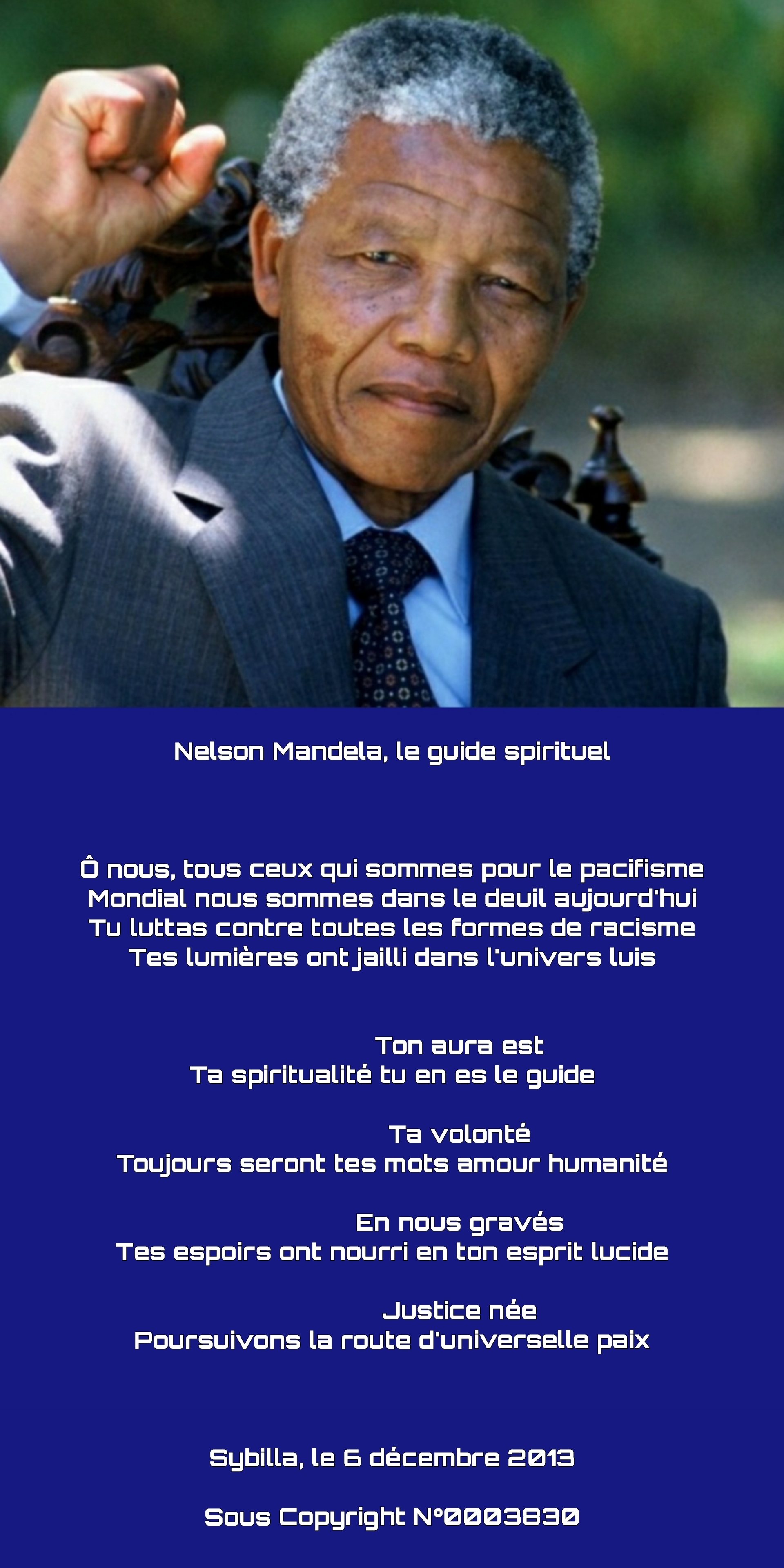 Votre poème est un hommage vibrant pour ce guide spirituel qui a passé plus d’un quart de siècle en prison et est en sorti libre et devenu président de son pays .