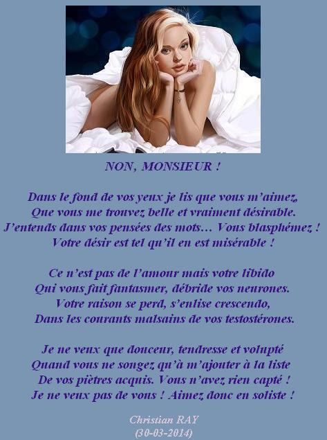 » Non, Monsieur ! « Accueil › Vos poèmes ***UN SEUL PAR JOUR*** Les « poèmes » érotiques descriptifs ne sont pas les bienvenus... Ce sujet contient 5 réponses, 6 participants et a été mis à jour pour la dernière fois par TIZI MOHAMED, le 29-02-2024 20:10. Vous lisez 5 fils de discussion Auteur Messages 28 février 2024 à 15h02 #3498737 Mascotte d'Oasis Noel-Opan Sujet: 1825Réponses: 9624 Ce me semble être un cas mouflé …Ton zigue ne devrait pas trop zigzaguer….comme à la pétanque : droit au but 28 février 2024 à 16h22 #3498746 Fran?ois Sujet: 300Réponses: 49951 Bonsoir Chris, une veste joliment poétisé Amitiés La po?sie, c'est comme la cuisine, le mot faitout 00063312-1 28 février 2024 à 19h41 #3498773 Alain Jegou Sujet: 153Réponses: 1991 J’imagine bien la scène… Le pauvre animal ne mangera pas ce soir… Ce pourrait être un bon message en ces temps qui courent. c'est toujours quand il est parti qu'on se rend compte que le bonheur ?tait l?! 29 février 2024 à 1h59 #3498817 Mascotte d'Oasis islander Sujet: 2940Réponses: 34198 oh le râteau, pauvre Casanova, en soliste il va réfléchir sur son avenir yann 29 février 2024 à 20h10 #2709654 Mascotte d'Oasis christian Sujet: 6554Réponses: 13392 [url=https://zupimages.net/viewer.php?id=24/09/s3dc.jpg][/url] Christian RAY avec Michel Drucker et Patrice Laffont 29 février 2024 à 20h10 #3499007 Mascotte d'Oasis TIZI MOHAMED Sujet: 1702Réponses: 25075 il a reçu un gifle qu’il doit s’en mordre les doigts https://www.edilivre.com/peregrinations-29f53ef39f.html/ https://www.edilivre.com/le-spleen-de-la-logique-de-l-absurde-2c490d0b23.html/ Auteur Messages Vous lisez 5 fils de discussion Vous devez être connecté pour répondre à ce sujet. Connexion Identifiant: Mot de passe: Rester connecté Connexion Log in / Register