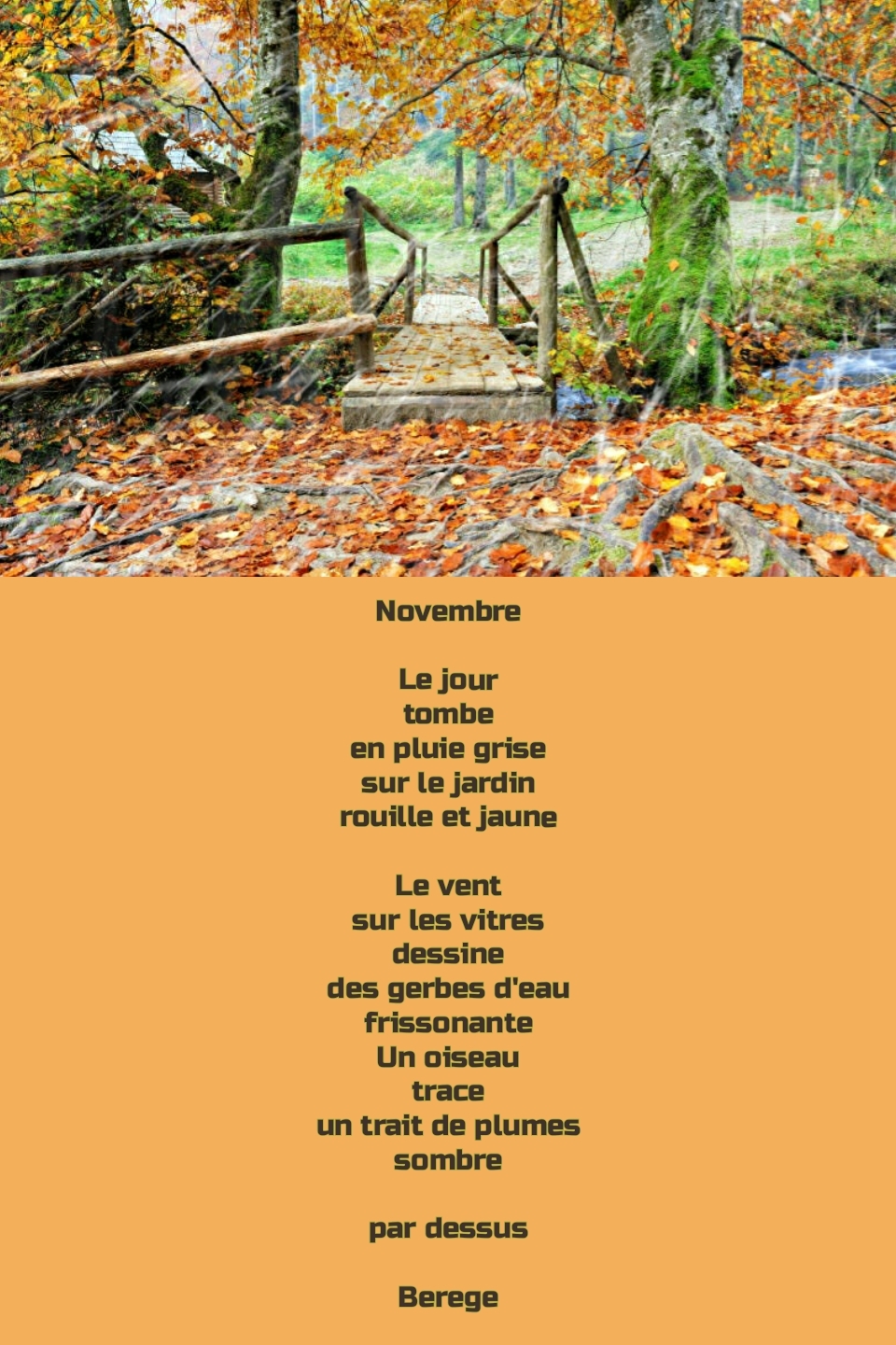Novembre Accueil › Vos poèmes ***UN SEUL PAR JOUR*** Les « poèmes » érotiques descriptifs ne sont pas les bienvenus... Ce sujet contient 9 réponses, 10 participants et a été mis à jour pour la dernière fois par Berege, le 09-11-2025 16:55. Créateur Sujet 9 novembre 2025 à 16h55 #2723518 Berege Sujet: 60Réponses: 125 Mise en page de Sybilla / Image web trouvée par Sybilla Le jour tombe en pluie grise sur le jardin rouille et jaune Le vent sur les vitres dessine des gerbes d’eau frissonante Un oiseau trace un trait de plumes sombre par dessus Créateur Sujet Vous lisez 8 fils de discussion Auteur Réponses 1 novembre 2025 à 16h11 #3591278 Mascotte d'Oasis jessye Sujet: 444Réponses: 7808 novembre le mois de ma naissance …. au plaisir C'est beau d'?tre seul(e). ?tre seul(e)ne signifie pas ?tre solitaire. Cela signifie que l'esprit ne vit pas sous influence et qu'il n'est pas pollu? par la soci?t?. [Jiddu Krishnamurti] 1 novembre 2025 à 17h10 #3591295 Fran?ois Sujet: 300Réponses: 49951 Bonsoir Berege, un mois joliment poétisé Amicalement La po?sie, c'est comme la cuisine, le mot faitout 00063312-1 1 novembre 2025 à 21h55 #3591336 SybillaMaître des clés Sujet: 5464Réponses: 79667 Bonsoir Cher Ami poète Berege, Ravie de ton retour parmi nous toutes et tous ! Une belle description poétique du mois de novembre ! Belle soirée Cher Ami poète Berege ! Toutes mes amitiés Sybilla Le r?ve est le poumon de ma vie (Citation de Sybilla) 1 novembre 2025 à 22h08 #3591341 HamidParticipant Sujet: 175Réponses: 2795 Un joli poème qui dépeint une atmosphère mélancolique de novembre avec beaucoup de finesse. Une lecture agréable. Hamid 3 novembre 2025 à 12h25 #3591588 Modératrice Isabelle M. Sujet: 70Réponses: 2419 Une ambiance joliment décrite ! Une belle lecture ! 3 novembre 2025 à 15h27 #3591597 Missi Sujet: 582Réponses: 719 Joli poème, j’ai aimé. Chat apprenti ?crivain. 5 novembre 2025 à 7h49 #3591820 Berege Sujet: 60Réponses: 125 Bonjour Merci à tous d’être venu me lire Aujourd’hui , le soleil me fait mentir. Il est resplendissant sur ma région 8 novembre 2025 à 16h36 #3592374 Webmaster joelParticipant Sujet: 56Réponses: 1643 Bonjour Berege J’ai le plaisir de t’annoncer que toute l’équipe de l’administration a élu ton poème « Coup de cœur ». Il sera mis sur la page d’accueil jusqu’au prochain « Coup de cœur ». Il sera également mis dans le recueil des « poèmes nominés » pour y rester définitivement. Toutes mes félicitations ! Cordialement Joël 9 novembre 2025 à 16h55 #3592468 Berege Sujet: 60Réponses: 125 Bonjour Un grand merci, encore, pour votre reconnaissance Ce site est décidément très vivant et je ne regrette pas d’en faire partie Oasis porte bien son nom Un lieu de partage serein et amical ,isolé de toute animosité Bien cordialement Bernard(berege) Auteur Réponses Vous lisez 8 fils de discussion Vous devez être connecté pour répondre à ce sujet. Connexion Identifiant: Mot de passe: Rester connecté Connexion Log in / Register