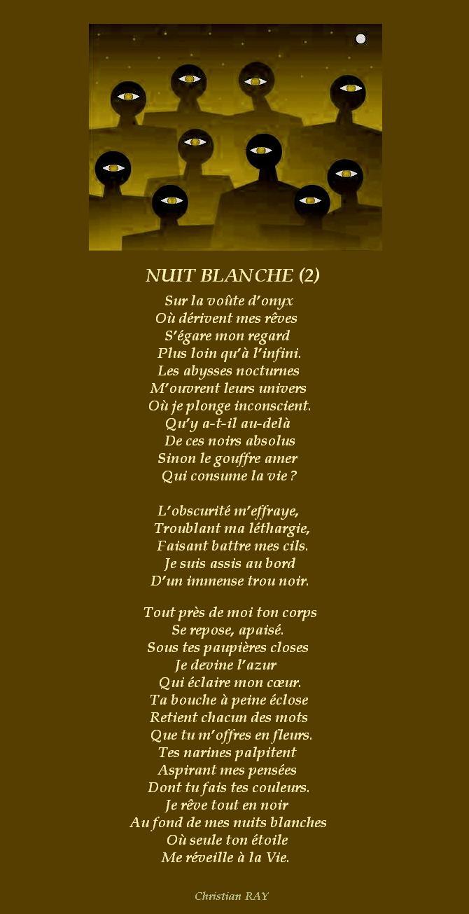 » NUIT BLANCHE Accueil › Vos poèmes ***UN SEUL PAR JOUR*** Les « poèmes » érotiques descriptifs ne sont pas les bienvenus... Ce sujet contient 2 réponses, 3 participants et a été mis à jour pour la dernière fois par Fran?ois, le 10-12-2025 17:32. Créateur Sujet 10 décembre 2025 à 17h32 #2724345 Mascotte d'Oasis christian Sujet: 6554Réponses: 13392 Christian RAY avec Michel Drucker et Patrice Laffont Créateur Sujet Vous lisez 1 fil de discussion Auteur Réponses 9 décembre 2025 à 21h34 #3596531 SybillaMaître des clés Sujet: 5464Réponses: 79667 Bonsoir Cher Ami poète Christian, Une poésie romantique et émouvante de toute beauté où l’insomnie évolue entre l’ombre et la lumière ! Belle soirée Cher Ami poète Christian ! Toutes mes amitiés Sybilla Le r?ve est le poumon de ma vie (Citation de Sybilla) 10 décembre 2025 à 17h32 #3596612 Fran?ois Sujet: 300Réponses: 49951 Bonsoir Chris, magnifique poème sur les nuits sans sommeil qui inspirent de très beaux vers mais à la longues nuisent au métabolisme Amitiés La po?sie, c'est comme la cuisine, le mot faitout 00063312-1 Auteur Réponses Vous lisez 1 fil de discussion Vous devez être connecté pour répondre à ce sujet. Connexion Identifiant: Mot de passe: Rester connecté Connexion Log in / Register