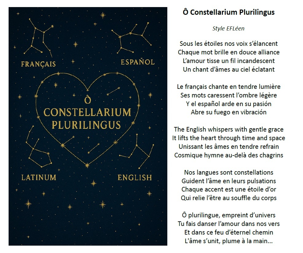 Un superbe poème qui exprime si bien avec cette association de langues la constellation qui rapproche les êtres humains de tous pays pour un cheminement fraternel.