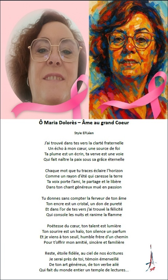 De superbes quatrains joliment rimés comme j’aime pour rendre un vibrant hommage détaillé avec ferveur et amitié à notre chère amie poétesse Maria Dolorès. Un style d’écriture que j’affectionne particulièrement et dont je tente également d’associer au mieux à ma propre écriture car j’aime les rimes et la musicalité qu’elles offrent.