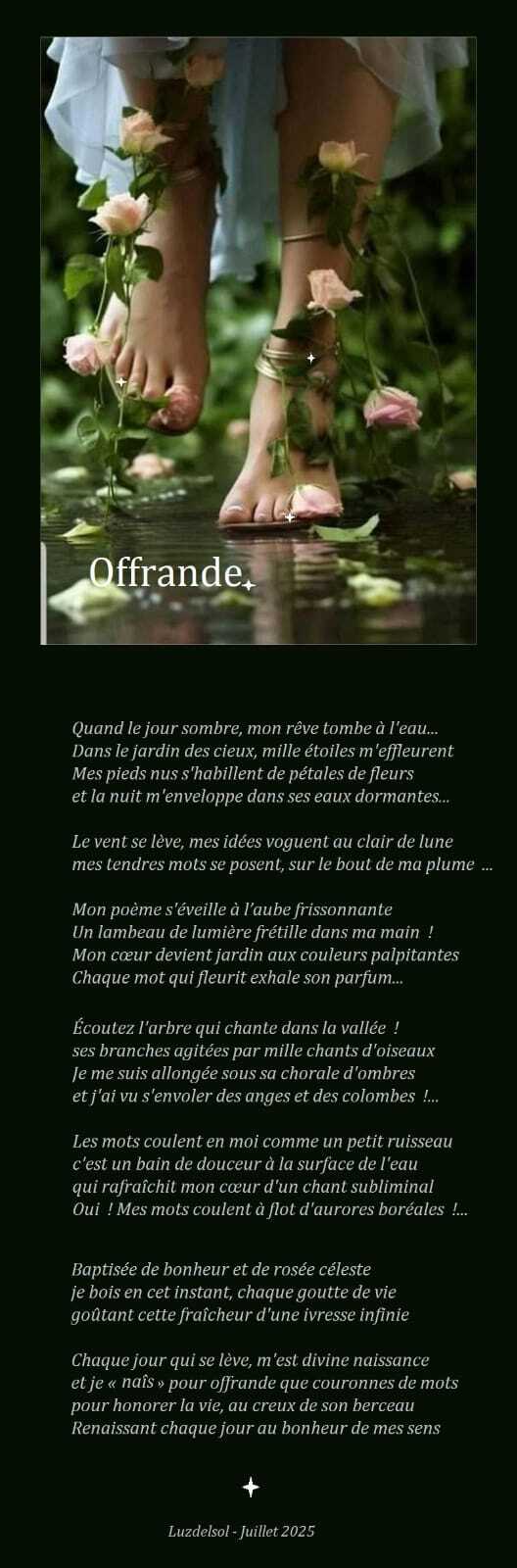 Un magnifique poème où vous célébrez la vie à travers les beautés de la nature que vous transfigurez et par vos mots poétiques qui sont à la fois « fleurs parfumées », « ruisseau « et « flot d’aurore boréale », de belles métaphores qui les caractérisent bien