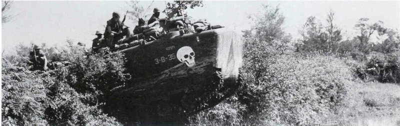 Voici un LVTP 5 servant de transportSur le LVTP 5 les soldats ont installés un canon sans recul au milieu des sacs de sable, ce qui vaut le surnom de bunker roulant à ces blindés