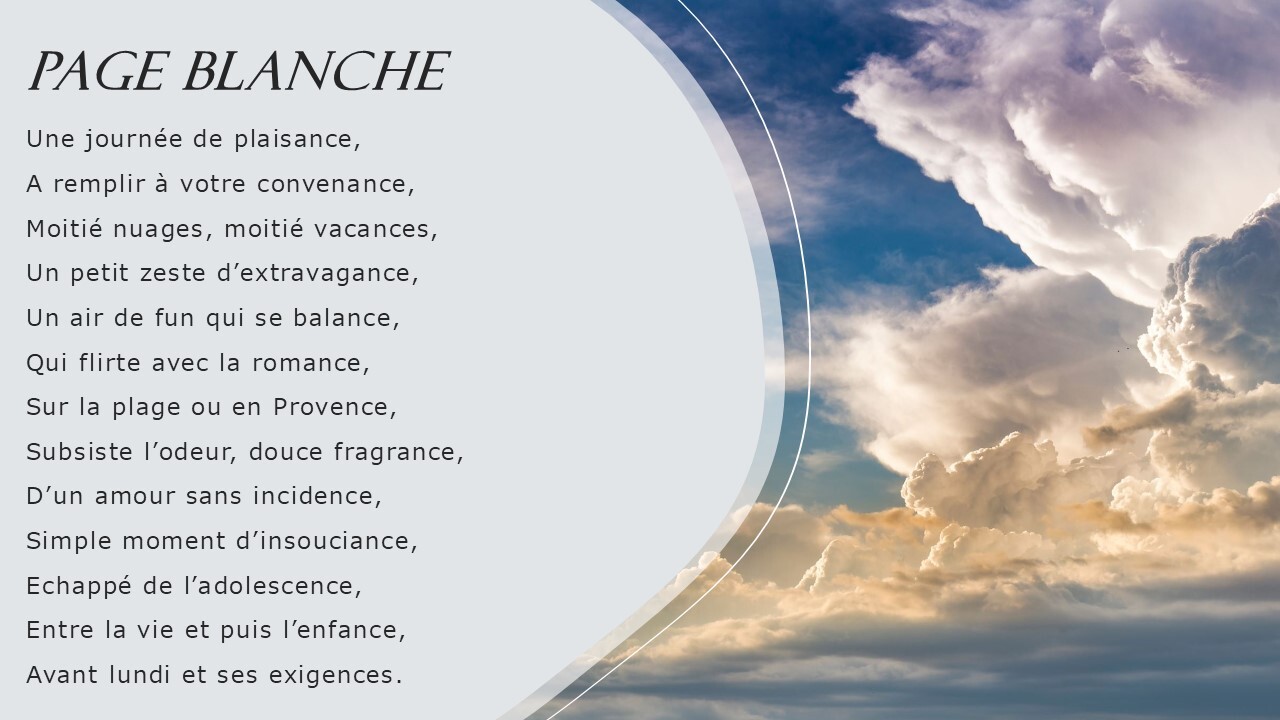 PAGE BLANCHE Accueil › Vos poèmes ***UN SEUL PAR JOUR*** Les « poèmes » érotiques descriptifs ne sont pas les bienvenus... Ce sujet contient 7 réponses, 8 participants et a été mis à jour pour la dernière fois par jean yves, le 22-03-2025 20:30. Créateur Sujet 22 mars 2025 à 20h30 #2718316 Patricia D’HENRY Sujet: 295Réponses: 1226 NAMASTE Mon recueil de po?sie UNE VIE EN BALADE est disponible sur la FNAC en ligne Créateur Sujet Vous lisez 6 fils de discussion Auteur Réponses 4 février 2025 à 20h44 #3555150 Sympatique Sujet: 615Réponses: 12189 une belle page du jour 4 février 2025 à 21h20 #3555151 CHAREF Sujet: 527Réponses: 3389 Belle page blanche pleine de belles image. Chaque homme porte en lui l'enfant qu'il ?tait Charef 5 février 2025 à 0h09 #3555159 Mascotte d'Oasis islander Sujet: 2940Réponses: 34198 profiter du week end, exquise poésie en monorime, bravo 5 février 2025 à 17h48 #3555236 Fran?ois Sujet: 300Réponses: 49951 Bonsoir TELEPAT, une page joliment noircie par la plume Amicalement La po?sie, c'est comme la cuisine, le mot faitout 00063312-1 6 février 2025 à 0h54 #3555275 SybillaMaître des clés Sujet: 5464Réponses: 79667 Bonsoir ma Chère Amie TELEPAT, Une belle page qui s’est emplie d’événements la bleuissant poétiquement ! Belle nuit Chère Amie poétesse TELEPAT ! Toutes mes amitiés Gros bisous Sybilla Le r?ve est le poumon de ma vie (Citation de Sybilla) 22 mars 2025 à 19h18 #3559329 CathysoleilParticipant Sujet: 241Réponses: 2842 Bonjour Telepat merci pour ce magnifique poème!! Merci de m'avoir lue. 00056292-1 22 mars 2025 à 20h30 #3559331 jean yves Sujet: 808Réponses: 624 Bonsoir Telepat une page blanche bien inspirée, Bravo : bravo: cher poète mes recueils : 1 https://www.edilivre.com/un-temps-au-dessus-du-temps-2a2594e4cf.html https://www.edilivre.com/un-temps-au-dessus-du-temps-2-2a25a45cff.html 2 edilivre /La rapsodie/ Auteur Réponses Vous lisez 6 fils de discussion Vous devez être connecté pour répondre à ce sujet. Connexion Identifiant: Mot de passe: Rester connecté Connexion Log in / Register