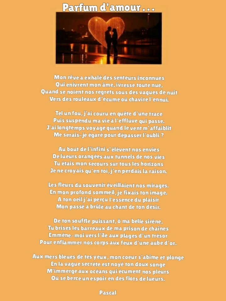 Pour enflammer nos corps aux feux d’une aube d’or.Aux mers bleues de tes yeux, mon coeur s’abîme et plonge