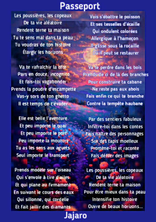 superbe poésie, fais comme l’oiseau, ça vit d’air pur et d’eau fraiche un oiseau, merci