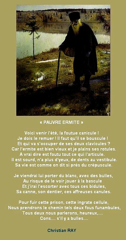 » PAUVRE ERMITE ! « Accueil › Vos poèmes ***UN SEUL PAR JOUR*** Les « poèmes » érotiques descriptifs ne sont pas les bienvenus... Ce sujet contient 5 réponses, 7 participants et a été mis à jour pour la dernière fois par Sybilla, le 15-10-2025 20:00. Vous lisez 5 fils de discussion Auteur Messages 15 octobre 2025 à 7h20 #3588466 Daniel Dive Sujet: 2141Réponses: 5677 Quelle empathie tu montres, dans ce poème, pour cette personne âgée et percluse par les maux. Ton humour fait bien les choses et adoucit le tableau sans le cacher toutefois. Tu sais, tu as un coeur « gros comme çà » qui transparaît dans tes textes. Bravo et merci pour cette merveilleuse lecture. Science sans conscience n'est que ruine de l'?me (Rabelais) 15 octobre 2025 à 7h24 #3588468 Fran?ois Sujet: 300Réponses: 49951 Bonjour Chris, très beau et touchant poème teinté de de gaieté Amitiés La po?sie, c'est comme la cuisine, le mot faitout 00063312-1 15 octobre 2025 à 14h59 #3588517 Thierry jeangneau Sujet: 551Réponses: 3509 Ermite et joyeux de l’être? N’est il pas pire des supporter Une personne que l’on ne supporte plus? C’est cher payé un bâton de vieillesse 15 octobre 2025 à 15h31 #3588524 Mascotte d'Oasis Marie-Thérèse H. Sujet: 1727Réponses: 26263 Bonjour Chris-Ray, Un pauvre Ermite que tu nous dépeins Beau poème merci du partage amitié https://www.youtube.com/channel/UCpZt6YdLXLyMVA004T1KoiQ ... 15 octobre 2025 à 20h00 #2723078 Mascotte d'Oasis christian Sujet: 6554Réponses: 13392 Christian RAY avec Michel Drucker et Patrice Laffont 15 octobre 2025 à 20h00 #3588561 SybillaMaître des clés Sujet: 5464Réponses: 79667 Bonsoir Cher Ami poète Christian, Somptueuse poésie humaniste que j’ai adoré lire ! Belle soirée Cher Ami poète Christian ! Toutes mes amitiés Sybilla Le r?ve est le poumon de ma vie (Citation de Sybilla) Auteur Messages Vous lisez 5 fils de discussion Vous devez être connecté pour répondre à ce sujet. Connexion Identifiant: Mot de passe: Rester connecté Connexion Log in / Register