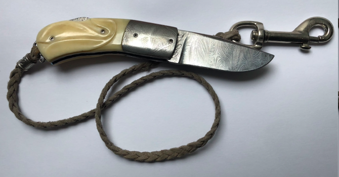 Acier damas lame et mitres, les platines en titane galvanisé (pas visible), les manches, ivoires d’éléphant achetés légalement il a quelques années, représentant d’une façon stylisé une baleine !