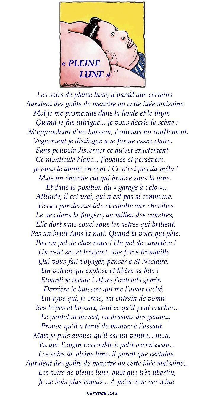 » PLEINE LUNE » (Humour en ruralité) Accueil › Vos poèmes ***UN SEUL PAR JOUR*** Les « poèmes » érotiques descriptifs ne sont pas les bienvenus... Ce sujet contient 4 réponses, 5 participants et a été mis à jour pour la dernière fois par RomanNovel, le 21-10-2025 20:10. Créateur Sujet 21 octobre 2025 à 20h10 #2723172 Mascotte d'Oasis christian Sujet: 6554Réponses: 13392 Christian RAY avec Michel Drucker et Patrice Laffont Créateur Sujet Vous lisez 3 fils de discussion Auteur Réponses 19 octobre 2025 à 17h56 #3589067 Fran?ois Sujet: 300Réponses: 49951 Bonsoir Chris, des nuits particulières joliment conté Amitiés La po?sie, c'est comme la cuisine, le mot faitout 00063312-1 19 octobre 2025 à 19h04 #3589075 SybillaMaître des clés Sujet: 5464Réponses: 79667 Bonsoir Cher Ami poète Christian, Une situation fort cocasse et humoristique sous ta plume ! Belle soirée Cher Ami poète Christian ! Toutes mes amitiés Sybilla Le r?ve est le poumon de ma vie (Citation de Sybilla) 20 octobre 2025 à 9h35 #3589159 Christophe Bellanger Sujet: 315Réponses: 532 Bonjour Merci pour cette franche rigolade. C’est subtil, jubilatoire et fort bien écrit. Bravo Amicalement Christophe61 [email]bebel61@free.fr[/email] 21 octobre 2025 à 20h10 #3589423 Mascotte d'Oasis RomanNovel Sujet: 1171Réponses: 10526 Bonjour Chris, Superbe poème très humoristique sur cette situation très coquine et libertine sous l’effet de la lune. Amitié, Roman Auteur Réponses Vous lisez 3 fils de discussion Vous devez être connecté pour répondre à ce sujet. Connexion Identifiant: Mot de passe: Rester connecté Connexion Log in / Register