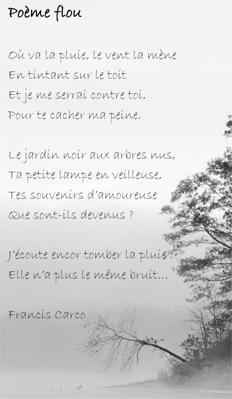 Poème flou (Francis Carco) Accueil › Poèmes d’auteurs Ce sujet contient 1 réponse, 2 participants et a été mis à jour pour la dernière fois par eolienne, le 04-05-2015 21:32. Créateur Sujet 4 mai 2015 à 21h32 #2639556 Bulle Des Terres Sujet: 216Réponses: 1737 LJB - Site : LJB Auteur Créateur Sujet Vous lisez 0 fil de discussion Auteur Réponses 1 mai 2015 à 14h48 #2961130 Webmaster eolienne Sujet: 525Réponses: 17471 http://www.mespoemes.net/eolienne/ https://www.amazon.fr/Souffle-po?tique-Adeline-alias-?olienne/dp/2414163232 https://www.edilivre.com/sur-les-ailes-d-eole-adeline-mela-eolienne.html Auteur Réponses Vous lisez 0 fil de discussion Vous devez être connecté pour répondre à ce sujet. Connexion Identifiant: Mot de passe: Rester connecté Connexion Log in / Register