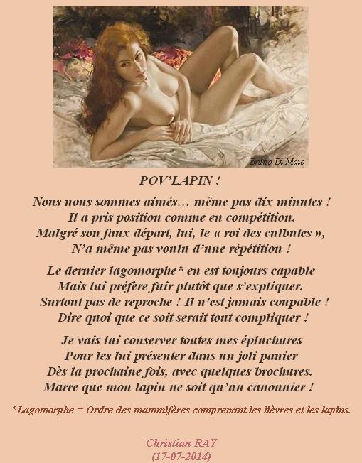 » POV’ LAPIN ! « Accueil › Vos poèmes ***UN SEUL PAR JOUR*** Les « poèmes » érotiques descriptifs ne sont pas les bienvenus... Ce sujet contient 5 réponses, 6 participants et a été mis à jour pour la dernière fois par Sybilla, le 19-07-2025 19:13. Créateur Sujet 19 juillet 2025 à 19h13 #2721358 Mascotte d'Oasis christian Sujet: 6554Réponses: 13392 Christian RAY avec Michel Drucker et Patrice Laffont Créateur Sujet Vous lisez 4 fils de discussion Auteur Réponses 19 juillet 2025 à 6h13 #3576175 Mascotte d'Oasis islander Sujet: 2940Réponses: 34198 sans doute la faute à lapine, hum, elle devra lui apprendre les bonnes manières, texte exquis 19 juillet 2025 à 12h45 #3576193 Georgiu Cornel Sujet: 453Réponses: 3002 Ce sont toujours les autres, jamais moi, un lapinou Voilà, de nouveaux mots pour ma part, qui pourront enrichir mes dialogues Subtils jeux de mots, pour une finale aussi subtile Super ! 19 juillet 2025 à 14h04 #3576200 Mascotte d'Oasis TIZI MOHAMED Sujet: 1702Réponses: 25075 elle ne l’a pas chauffé, c’est pour cela qu’il a joué « de passage à bientôt » https://www.edilivre.com/peregrinations-29f53ef39f.html/ https://www.edilivre.com/le-spleen-de-la-logique-de-l-absurde-2c490d0b23.html/ 19 juillet 2025 à 15h14 #3576213 Fran?ois Sujet: 300Réponses: 49951 Bonsoir Chris, très belle amusette de la plume polissonne Amitiés La po?sie, c'est comme la cuisine, le mot faitout 00063312-1 19 juillet 2025 à 19h13 #3576241 SybillaMaître des clés Sujet: 5464Réponses: 79667 Bonsoir Cher Ami poète Christian, C’est Speedy Gonzales alors ! Merci pour cet éclat de rire ! Belle soirée Cher Ami poète Christian ! Toutes mes amitiés Sybilla Le r?ve est le poumon de ma vie (Citation de Sybilla) Auteur Réponses Vous lisez 4 fils de discussion Vous devez être connecté pour répondre à ce sujet. Connexion Identifiant: Mot de passe: Rester connecté Connexion Log in / Register