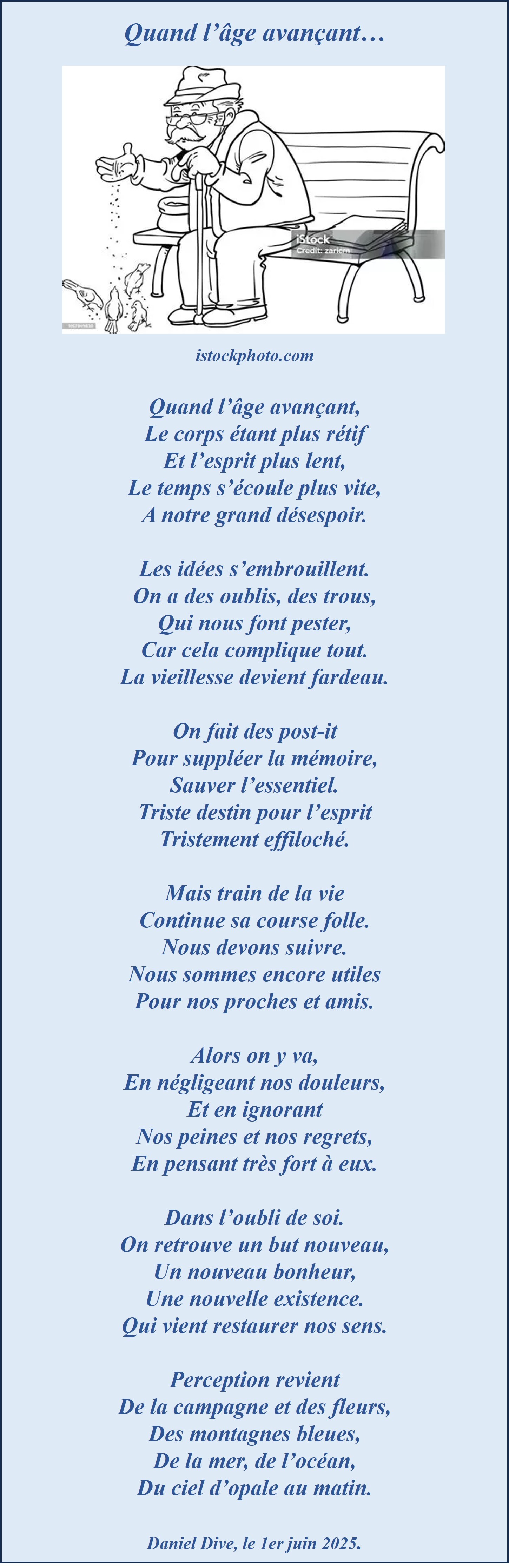 Un chant émouvant que je perçois comme un chemin, une trace où un jour tout le monde y aura sa place. Et il arrive parfois bien plus vite qu’on ne le voudrait! Joli poème  » Quand l’âge avançant… »