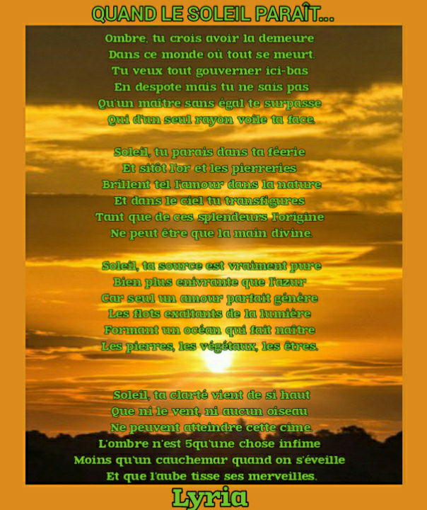 Un poème lumineux aux vers rayonnants qui rend superbement hommage à l’astre solaire !!!!!
