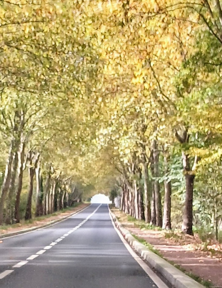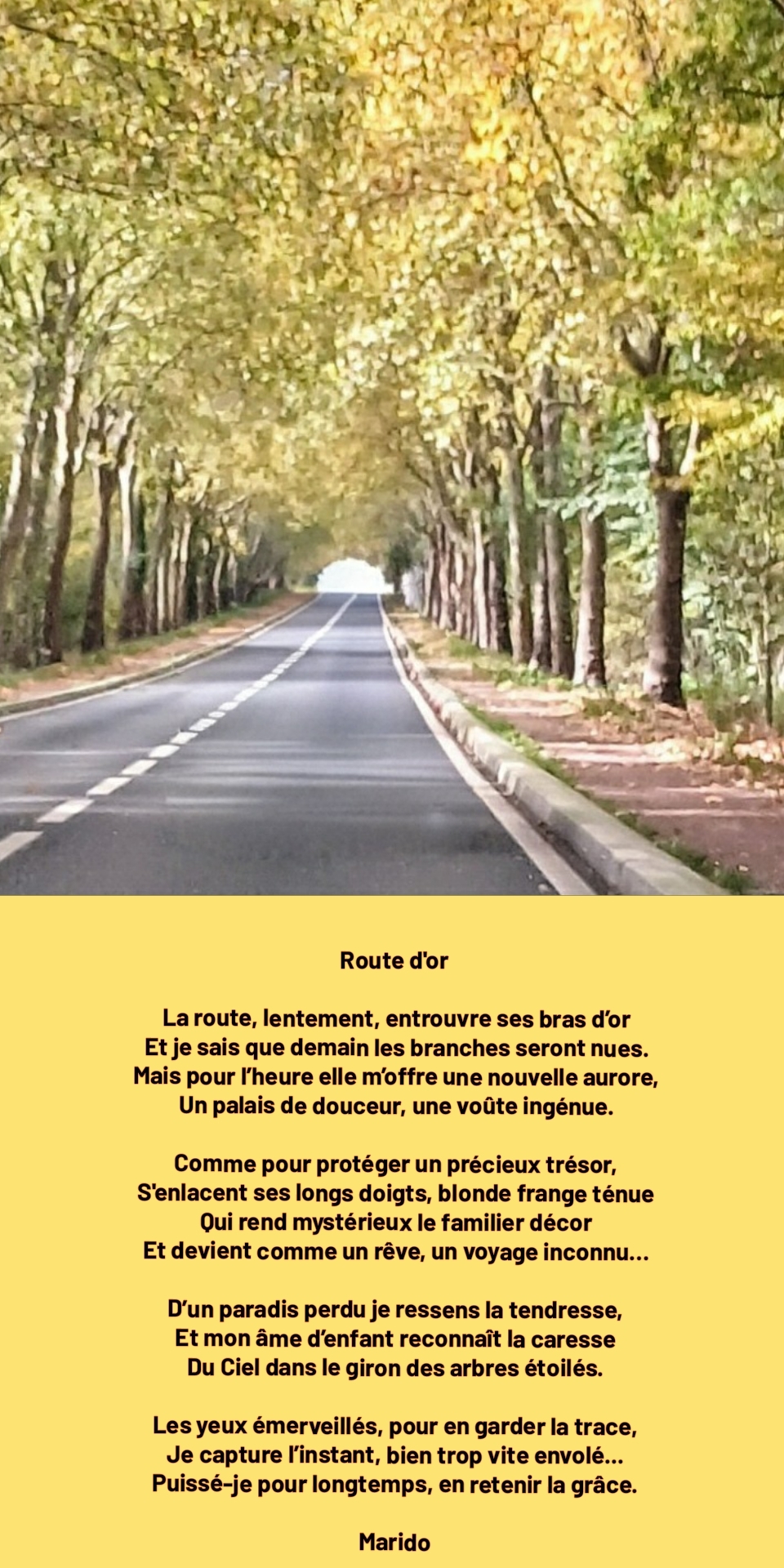Un magnifique poème que j’apprécie beaucoup et qui fait de cette route bordée d’arbres que l’automne a couvert d’or, un lieu enchanteur qui nous transporte loin de la terre dans un Eden féerique