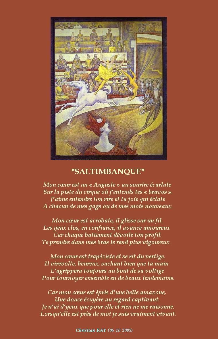 » SALTIMBANQUE « Accueil › Vos poèmes ***UN SEUL PAR JOUR*** Les « poèmes » érotiques descriptifs ne sont pas les bienvenus... Ce sujet contient 4 réponses, 6 participants et a été mis à jour pour la dernière fois par Julien Lou Baccarat, le 16-06-2024 18:25. Créateur Sujet 16 juin 2024 à 18h25 #2712577 Mascotte d'Oasis christian Sujet: 6554Réponses: 13392 [url=https://zupimages.net/viewer.php?id=24/24/0wa4.jpg][/url] Christian RAY avec Michel Drucker et Patrice Laffont Créateur Sujet Vous lisez 3 fils de discussion Auteur Réponses 13 juin 2024 à 6h18 #3518700 Mascotte d'Oasis isabelle Sujet: 2648Réponses: 13734 j’aime beaucoup les images que nous offre ce poème » de saltimbanque »… bravo et merci pour cette superbe lecture. 13 juin 2024 à 16h24 #3518757 Fran?ois Sujet: 300Réponses: 49951 Bonsoir Chris, magnifique poème, le saltimbanque, un grand artiste Amitiés La po?sie, c'est comme la cuisine, le mot faitout 00063312-1 13 juin 2024 à 20h42 #3518843 SybillaMaître des clés Sujet: 5464Réponses: 79667 Bonsoir ChrisR, Superbe poésie où tout n’est que douceur et tendresse en chacun de tes très beaux vers ! C’est très beau ! Belle soirée Cher Ami poète ChrisR ! Toutes mes amitiés Sybilla Le r?ve est le poumon de ma vie (Citation de Sybilla) 16 juin 2024 à 18h25 #3519464 Julien Lou Baccarat Sujet: 170Réponses: 1001 Un sublime chant du cœur avec un lexique du cirque et j’ai particulièrement adoré la chute. Que de beaux jours pour vous deux ! Auteur Réponses Vous lisez 3 fils de discussion Vous devez être connecté pour répondre à ce sujet. Connexion Identifiant: Mot de passe: Rester connecté Connexion Log in / Register