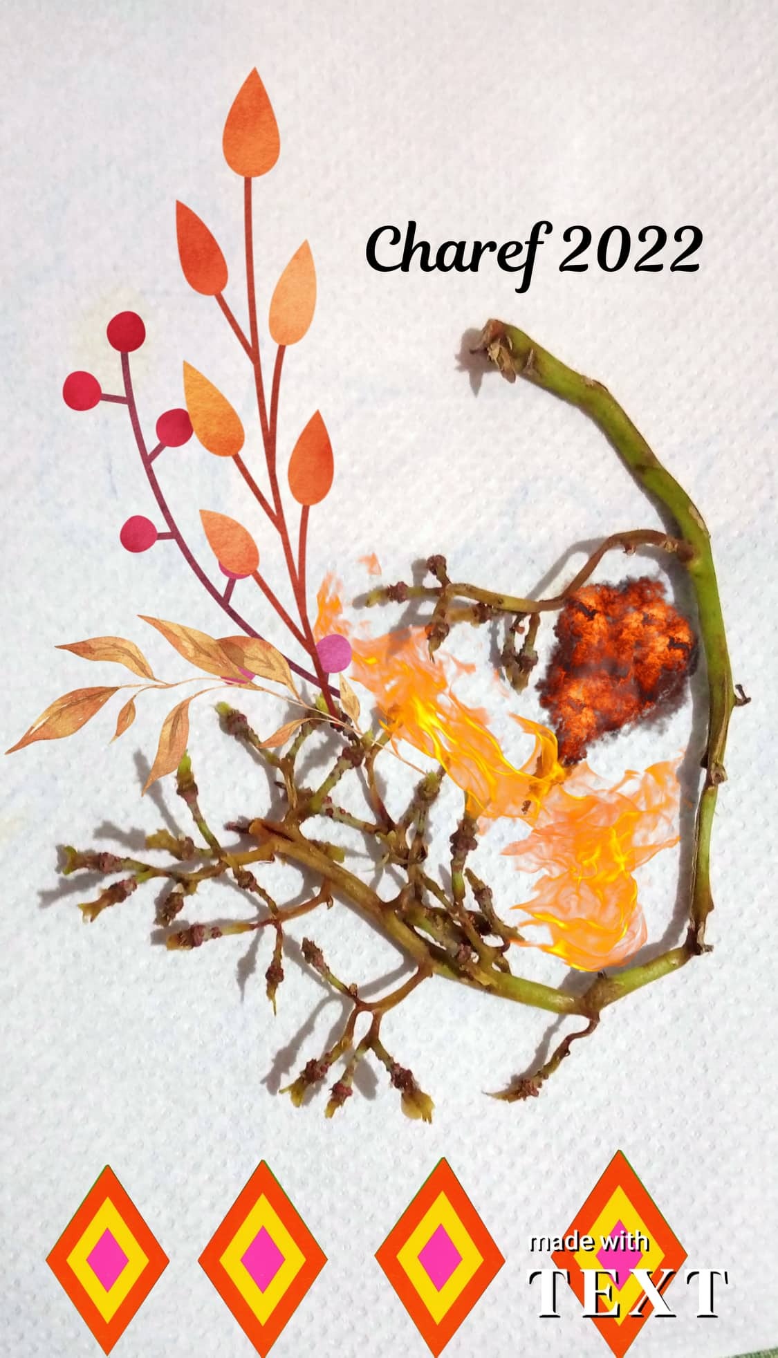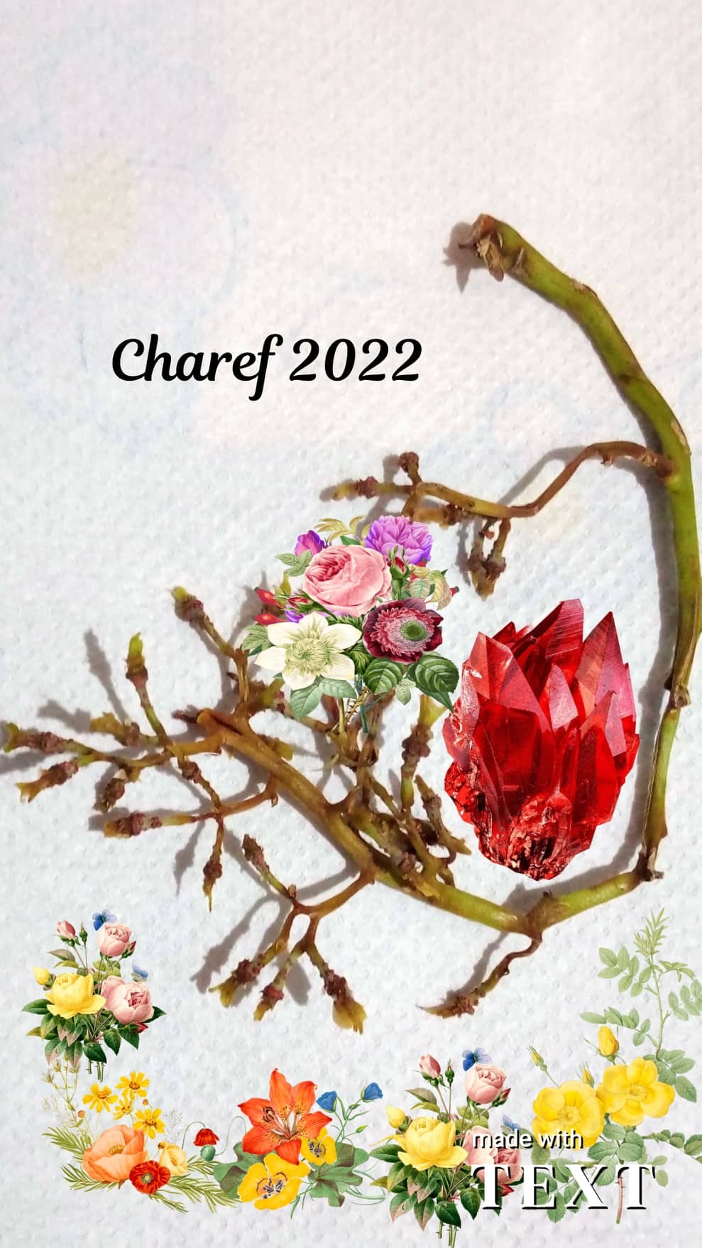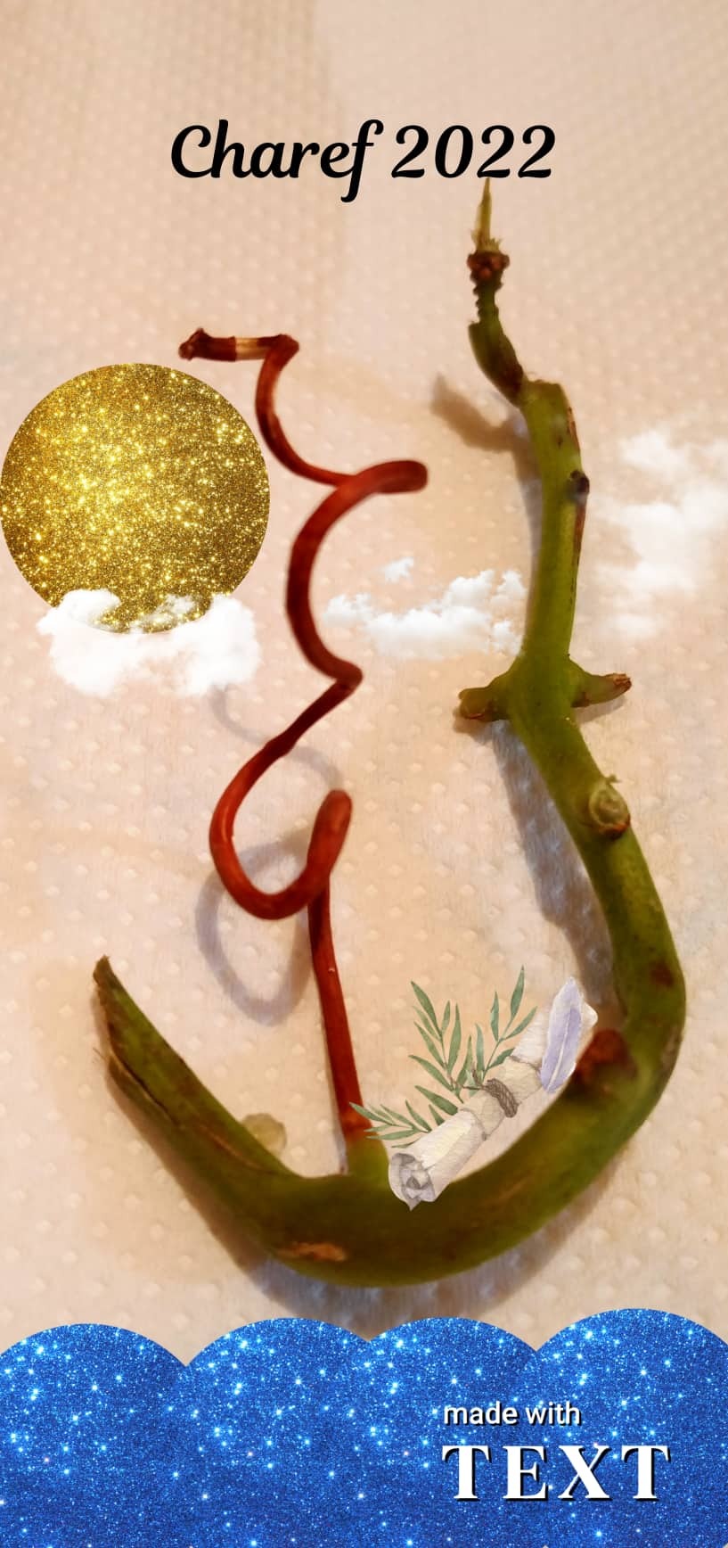 Création-montage d’une photo prise de rameaux de vigne ligneux qui me sont restés dans les mains après la dégustation d’une grappe de raisin de table. Montage réalisé avec l’aide d’une application enregistrée sur le net.