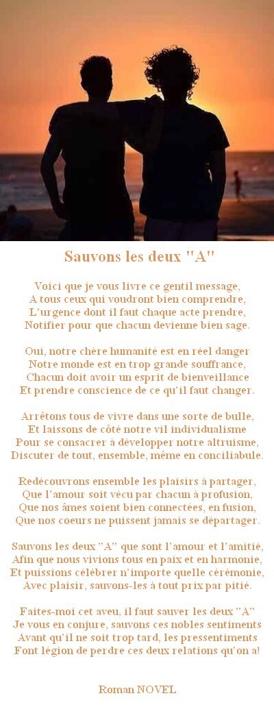 Magnifique message à travers ces deux A !Dans ce monde égoiste et matérialiste où l’espoir semble disparaitre de jour en jour faisons revivre l’Amitié et l ‘Amour !