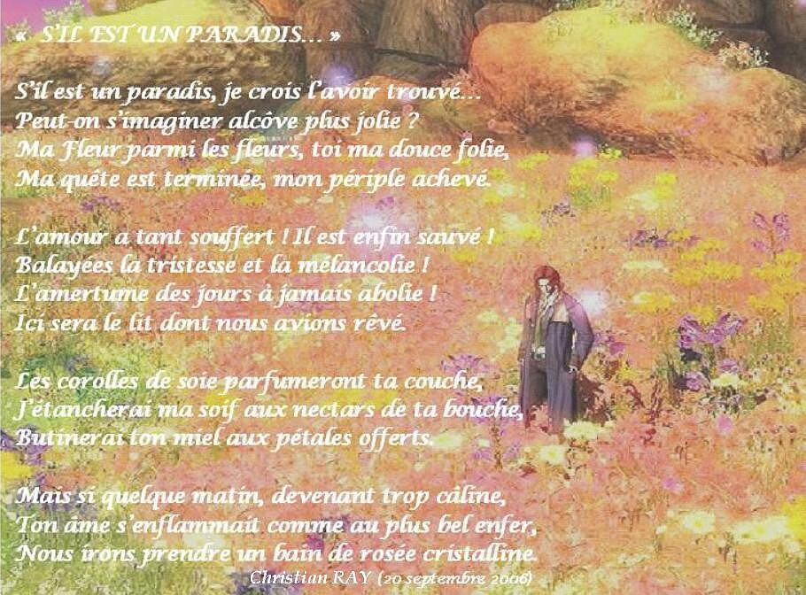 » S’IL EST UN PARADIS « Accueil › Vos poèmes ***UN SEUL PAR JOUR*** Les « poèmes » érotiques descriptifs ne sont pas les bienvenus... Ce sujet contient 4 réponses, 5 participants et a été mis à jour pour la dernière fois par isabelle, le 19-06-2024 19:14. Créateur Sujet 19 juin 2024 à 19h14 #2712608 Mascotte d'Oasis christian Sujet: 6554Réponses: 13392 [url=https://zupimages.net/viewer.php?id=24/24/bqme.jpg][/url] Christian RAY avec Michel Drucker et Patrice Laffont Créateur Sujet Vous lisez 3 fils de discussion Auteur Réponses 14 juin 2024 à 7h09 #3518902 Sympatique Sujet: 615Réponses: 12189 l’amour rend fou oui 14 juin 2024 à 16h24 #3518954 Fran?ois Sujet: 300Réponses: 49951 Bonsoir Chris, sublime poème Amitiés La po?sie, c'est comme la cuisine, le mot faitout 00063312-1 14 juin 2024 à 23h45 #3519039 SybillaMaître des clés Sujet: 5464Réponses: 79667 Bonsoir ChrisR, Quelle magnifique poésie romantique et pleine de douceur ! Belle soirée Cher Ami poète ChrisR ! Toutes mes amitiés Sybilla Le r?ve est le poumon de ma vie (Citation de Sybilla) 19 juin 2024 à 19h14 #3519852 Mascotte d'Oasis isabelle Sujet: 2648Réponses: 13734 il est très beau ce poème… et croyez moi..il est un paradis… Auteur Réponses Vous lisez 3 fils de discussion Vous devez être connecté pour répondre à ce sujet. Connexion Identifiant: Mot de passe: Rester connecté Connexion Log in / Register