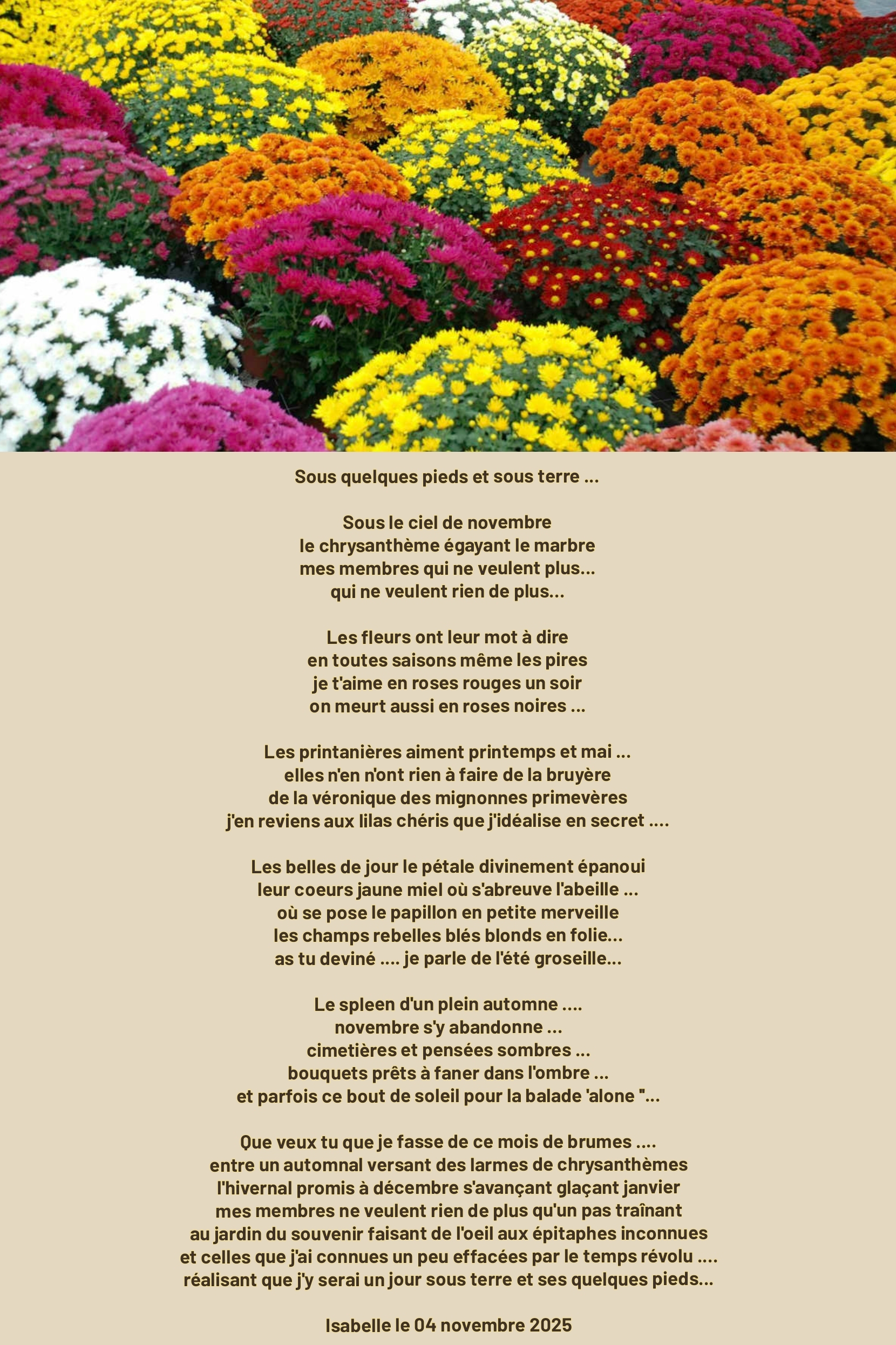 réalisant que j’y serai un jour sous terre et ses quelques pieds…Isabelle le 04 novembre 2025
