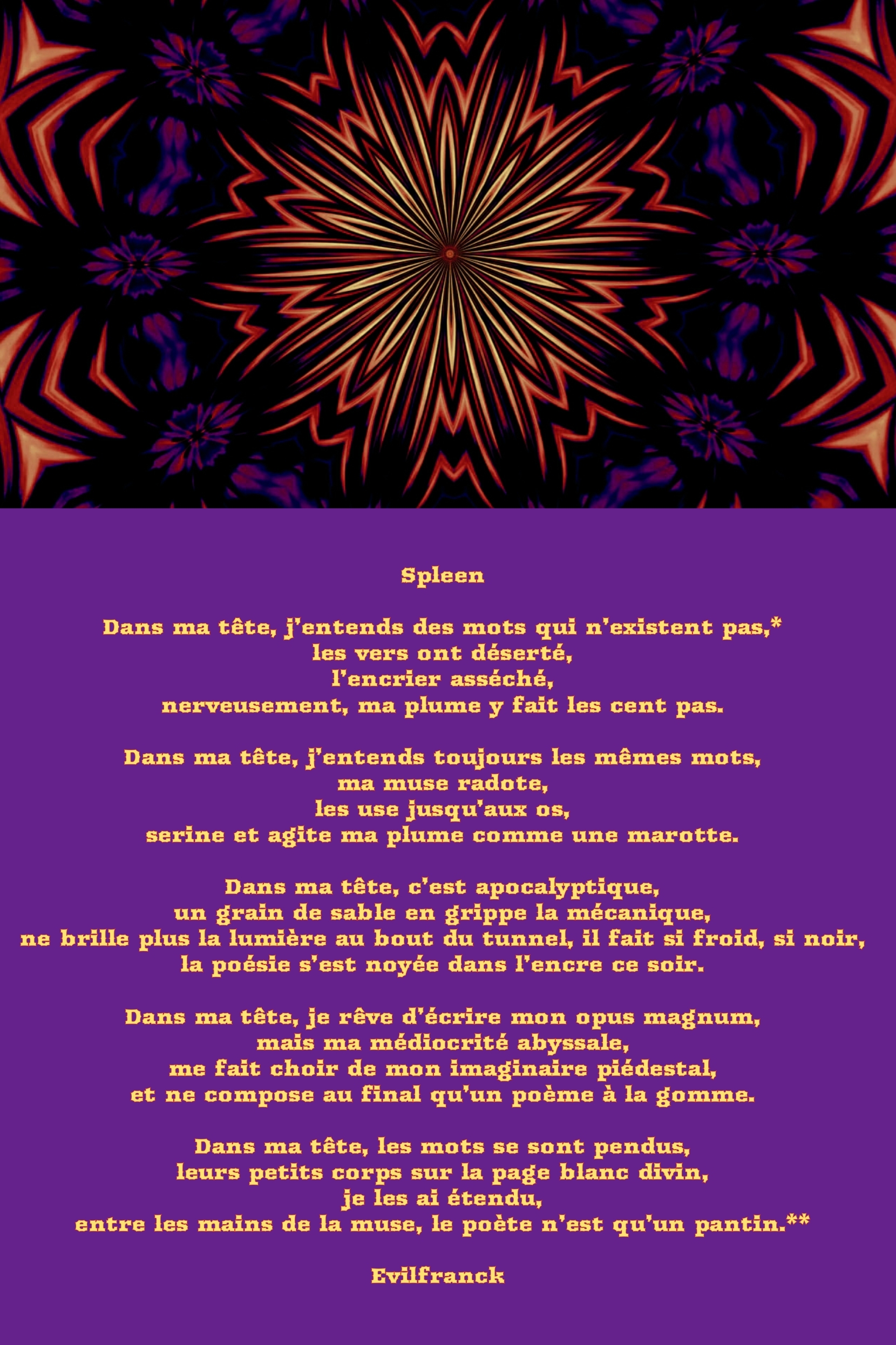 Bonsoir EvilFranck,Ce spleen est magnifique. La solitude du poète; c’est très beau!!