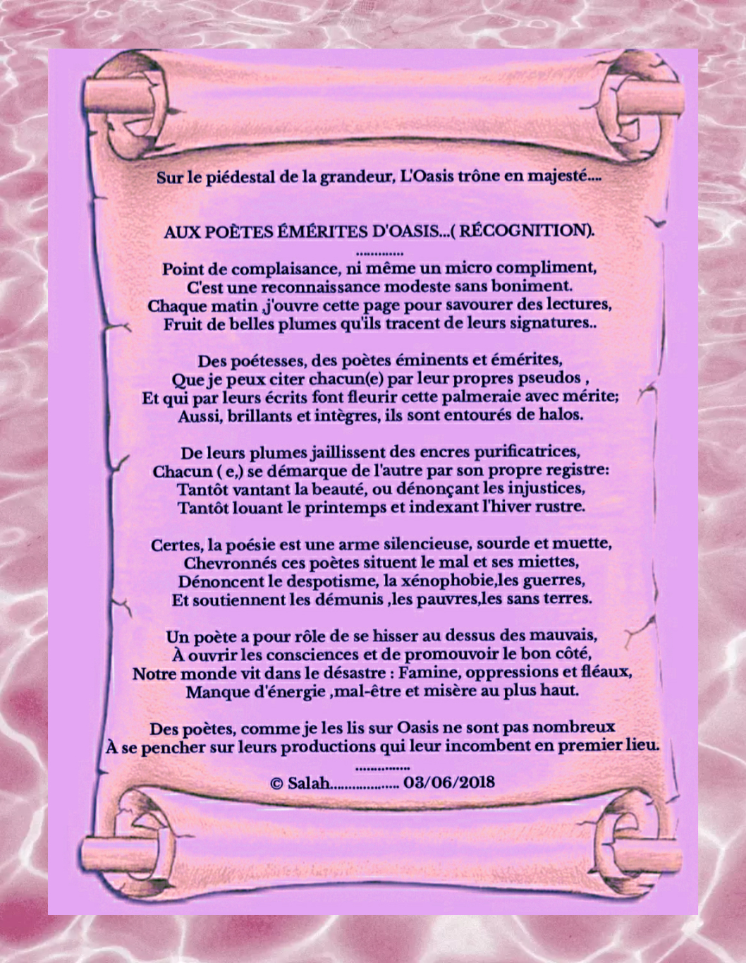 © Salah………………. 03/06/2018Ce poème est écrit en 2018 sous le pseudo de (Arslane) qui était mon premier pseudo à mes débuts sur Oasis.