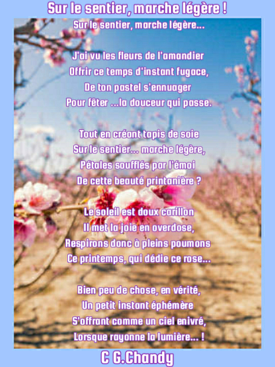 [size=small]Sur le sentier, marche légère …[/size]J’ai vu les fleurs de l’amandier