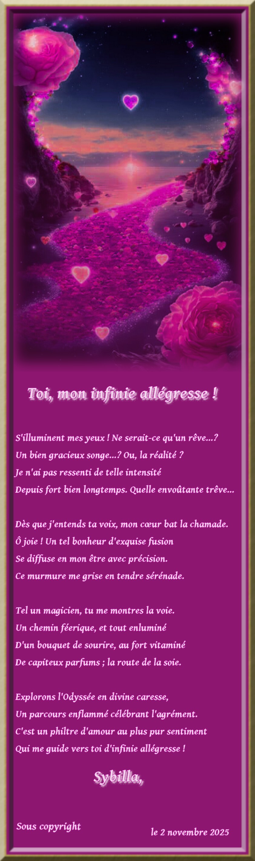 Un magnifique poème très touchant où vous célébrez la naissance d’un sentiment amoureux et l’immense joie qu’elle génère dans votre coeur au moyen d’images lumineusers: » Un chemin féerique et tout enluminé-D’un bouquet de sourires… » et ardentes: »Explorons l’Odyssée en divine caresse- Un parcours enflammé célébrant l’agrément. »De votre poème émane avec force l’euphorie que vous ressentez qui se transmet de manière authentique au lecteur. Merci Chère Sybilla de partager avec nous votre bonheur par cette si belle lecture que j’apprécie beaucoup. La mise en page de Maria Dolores est splendide et en pleine harmonie avec votre poème