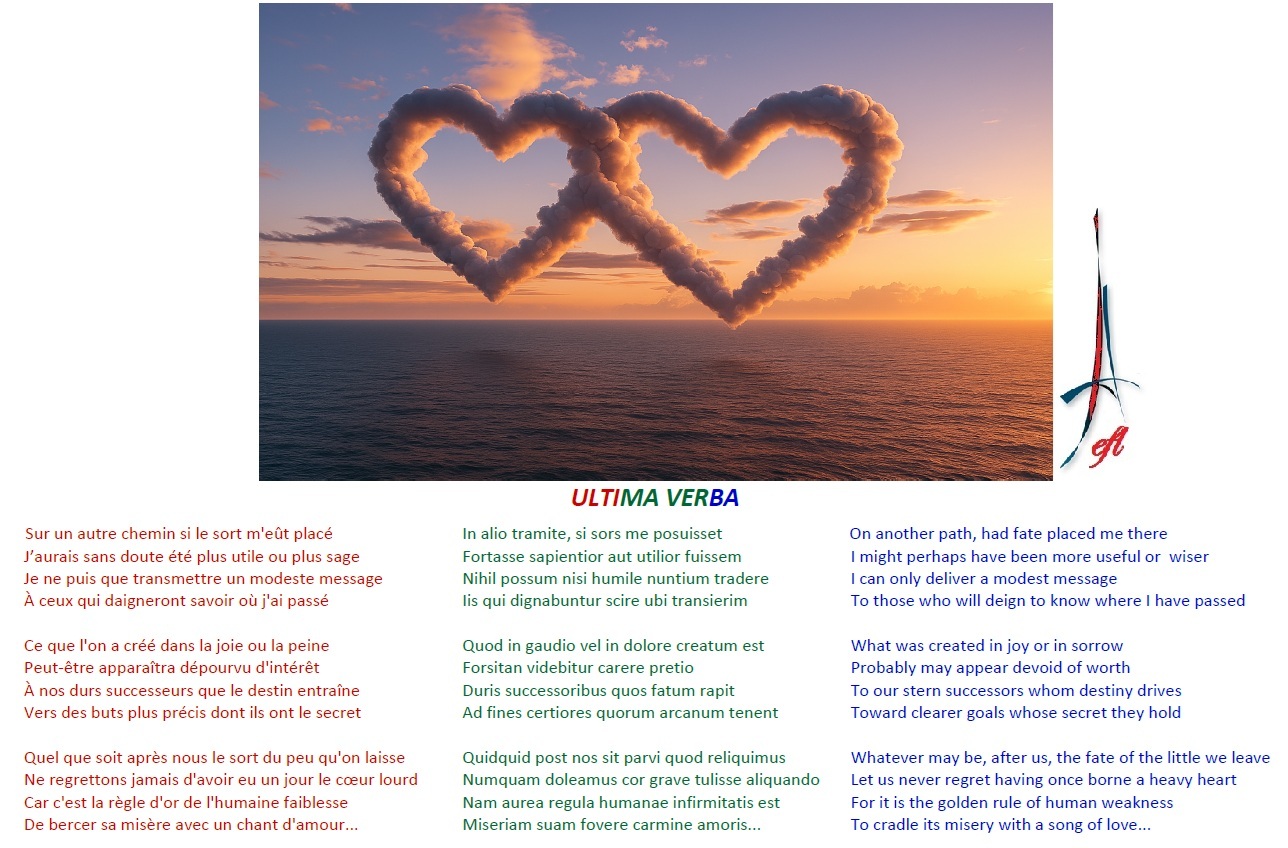 Ultima Verba Accueil › Vos poèmes ***UN SEUL PAR JOUR*** Les « poèmes » érotiques descriptifs ne sont pas les bienvenus... Ce sujet contient 4 réponses, 5 participants et a été mis à jour pour la dernière fois par Marido, le 28-09-2025 13:37. Créateur Sujet 28 septembre 2025 à 13h37 #2722708 Edmond Fr?d?ric L Sujet: 116Réponses: 320 Je dédie ce poème Ultima Verba : À tous les talents d’Oasis, sans exception Vous qui tissez des mots comme on tisse des songes Vous faites de ce lieu un écrin d’inspiration Un site d’exception où l’art et l’âme se prolongent… Créateur Sujet Vous lisez 3 fils de discussion Auteur Réponses 27 septembre 2025 à 11h52 #3585524 Mascotte d'Oasis Marie-Thérèse H. Sujet: 1727Réponses: 26263 Bonjour et merci Edmond, Tes mots sont le reflet d’un grand nombre d’artistes ici et là qui postent sur la toile peu importe mais tes mots résonnent en moi comme un soleil qui réchauffe mon coeur Merci pour cet agréable partage qui m’émeut bravo Bonne journée avec toute mon amitiés bises https://www.youtube.com/channel/UCpZt6YdLXLyMVA004T1KoiQ ... 27 septembre 2025 à 19h24 #3585557 SybillaMaître des clés Sujet: 5464Réponses: 79667 Bonsoir Cher poète EFL, Superbe poésie dédicacée aux poètes d’Oasis où tu encourages chacun à conserver l’espoir et l’amour universel dans le coeur ! J’ai adoré te lire ! Belle soirée Cher Ami poète EFL ! Toutes mes amitiés Sybilla Le r?ve est le poumon de ma vie (Citation de Sybilla) 28 septembre 2025 à 12h52 #3585678 Fran?ois Sujet: 300Réponses: 49951 Bonsoir EFL, superbe poème trilingue à Oasis et aux oasiennes et oasiens Amicalement La po?sie, c'est comme la cuisine, le mot faitout 00063312-1 28 septembre 2025 à 13h37 #3585688 Marido Sujet: 112Réponses: 1486 Ta chute est magnifique, de la grande poésie pour moi..un grand merci d’avoir si bien dit, en mots, ce que la musique dit plus facilement peut être… "Montrer le chemin sans se perdre Tendre la main sans s’oublier Prendre soin sans se renier Aimer sans jamais se dissoudre" Marido Auteur Réponses Vous lisez 3 fils de discussion Vous devez être connecté pour répondre à ce sujet. Connexion Identifiant: Mot de passe: Rester connecté Connexion Log in / Register